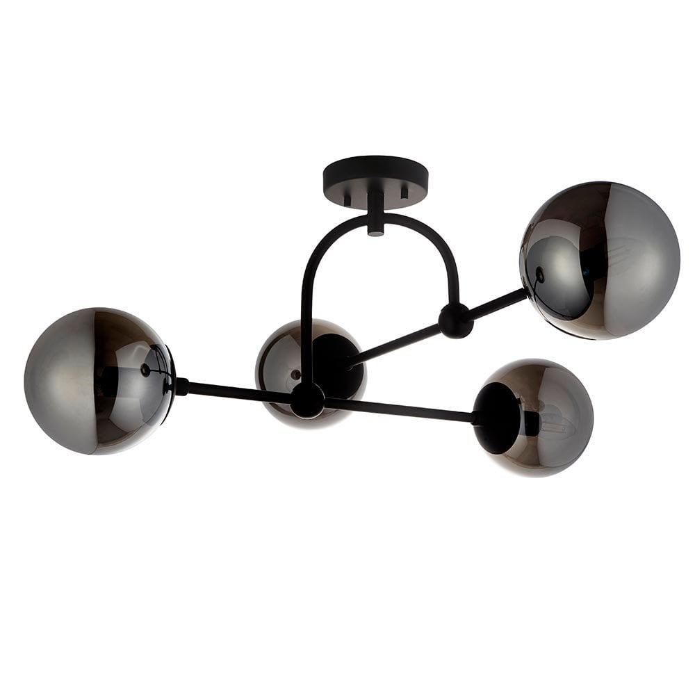 Making a nod to early Twentieth Century designs, this ceiling light features a matt black finish with four smoked mirror glass shades. The structure gives the design a reassuring solidity, while the circular lights appear to float effortlessly just below the ceiling. Matching items are available.