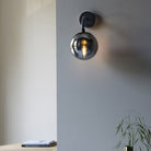 This simple yet stylish wall light is inspired by art deco globe lights. The matt black curves combine with a single smoked mirror glass sphere which gently diffuses the light. Matching items are available.