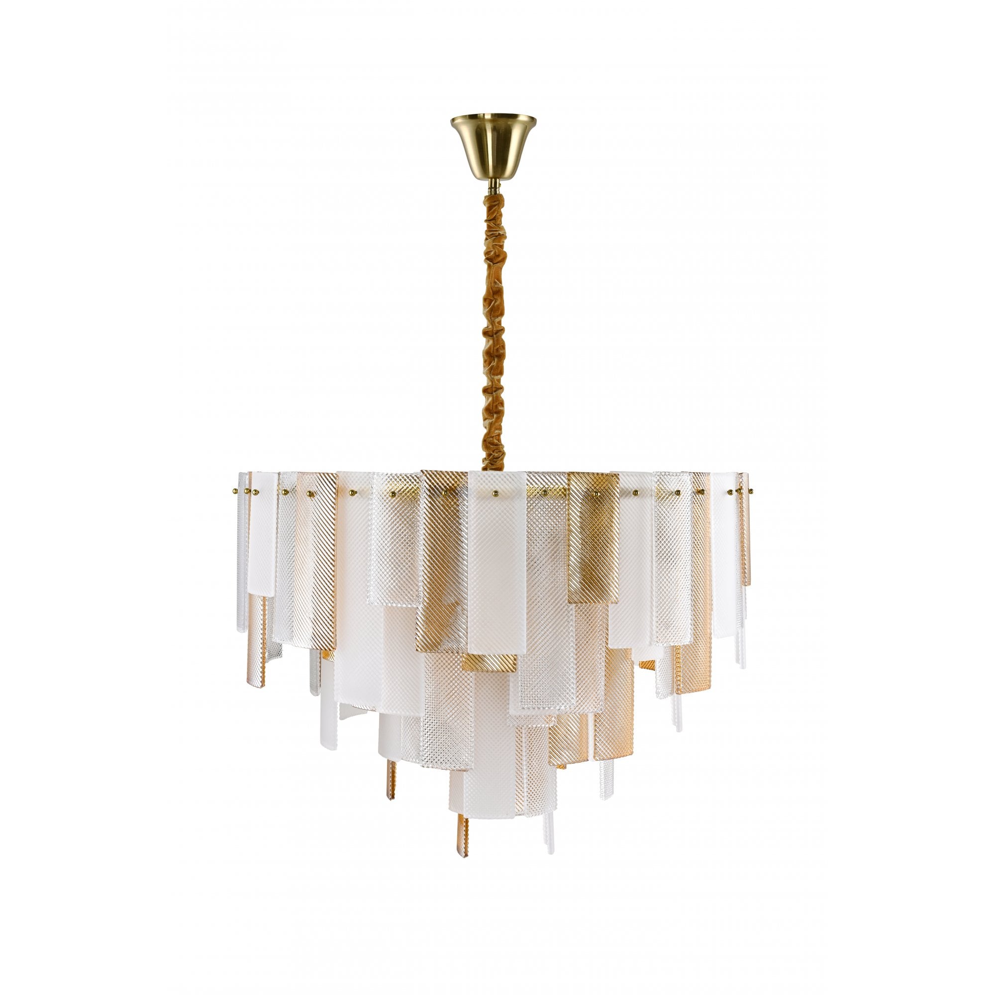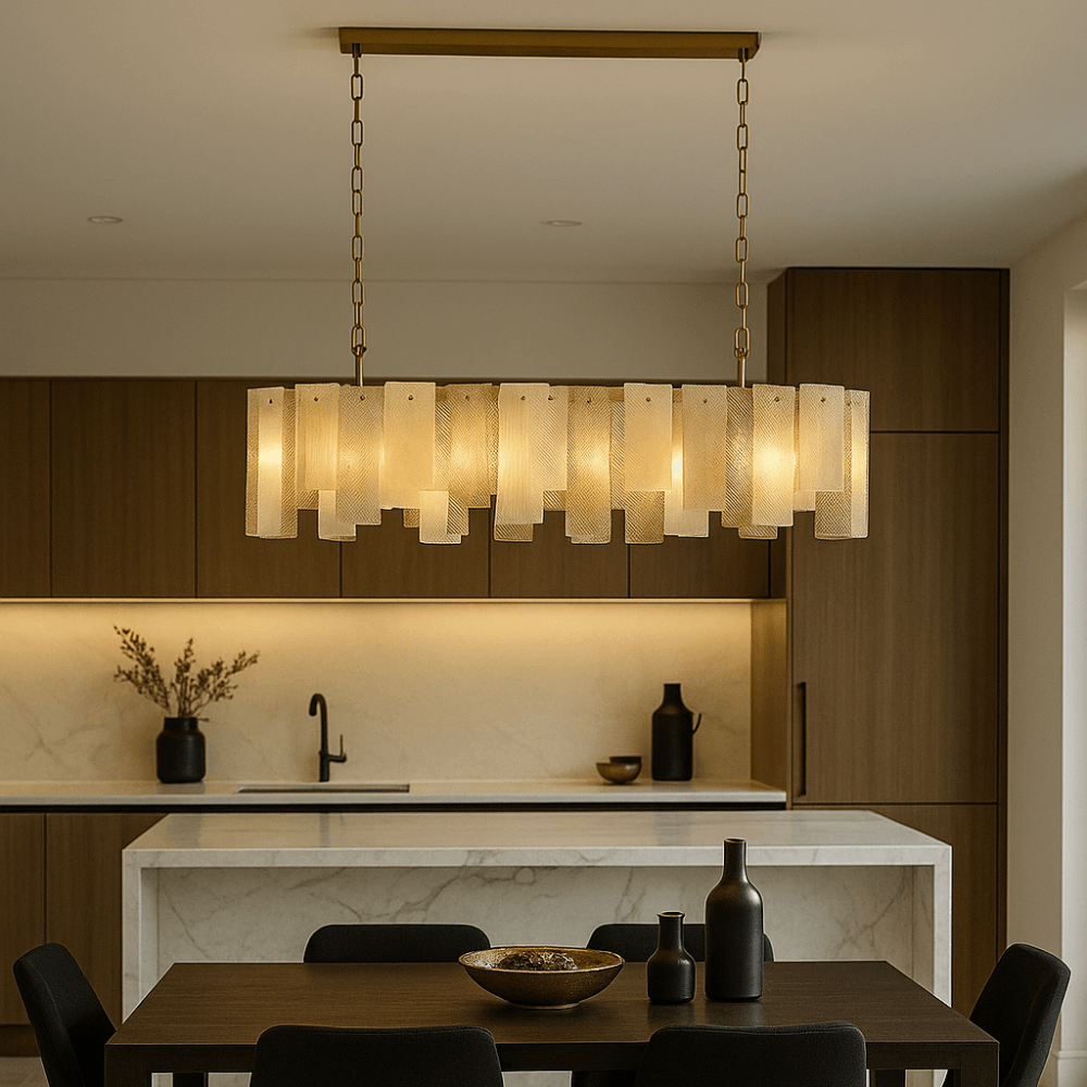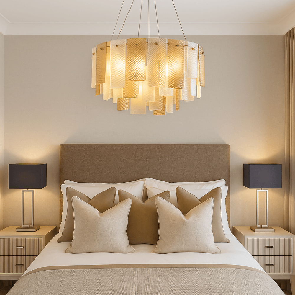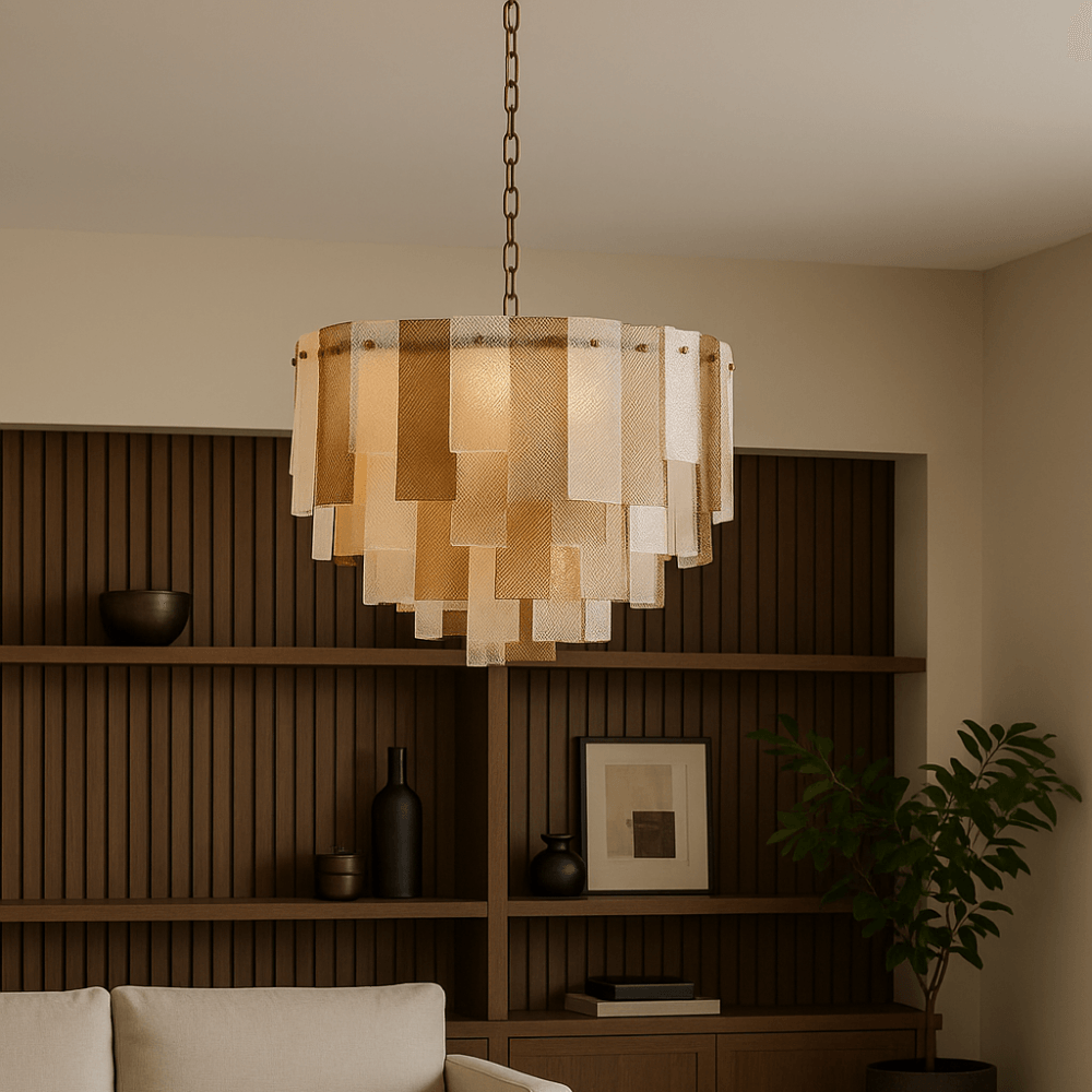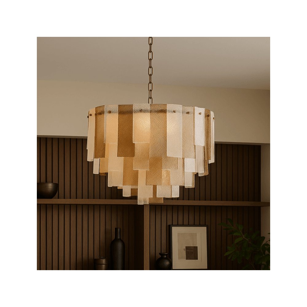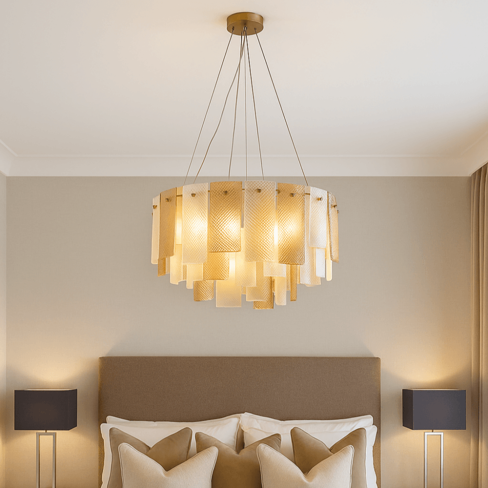 The Azzura Collection combines elegance and versatility with its striking diamond-etched glass shades in Clear, Frosted, and Cognac finishes. Each pendant is paired with a warm, luxurious gold metal frame, adding a touch of glamour to any interior. The intricate etched detailing enhances light diffusion, casting subtle reflections for a soft, atmospheric glow.