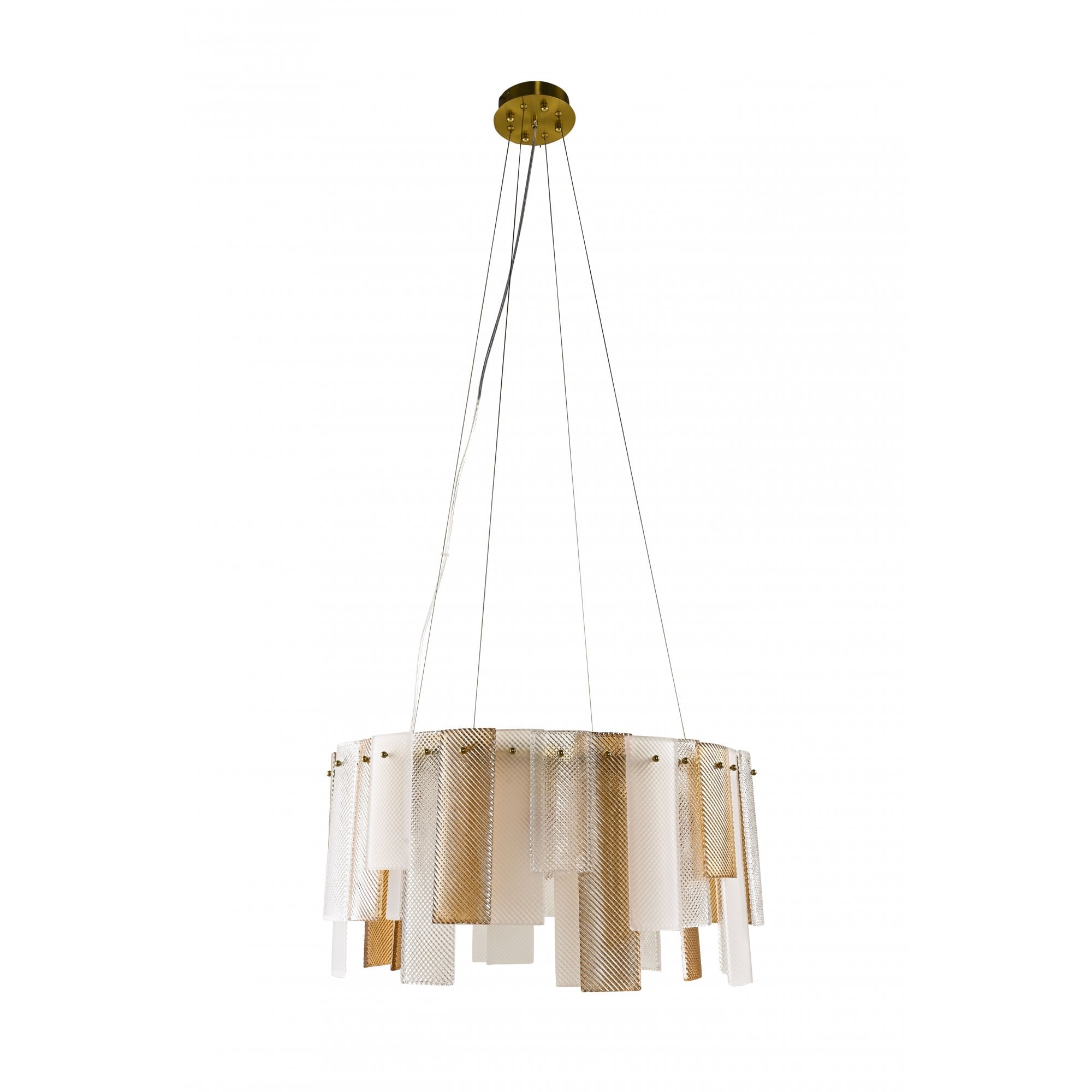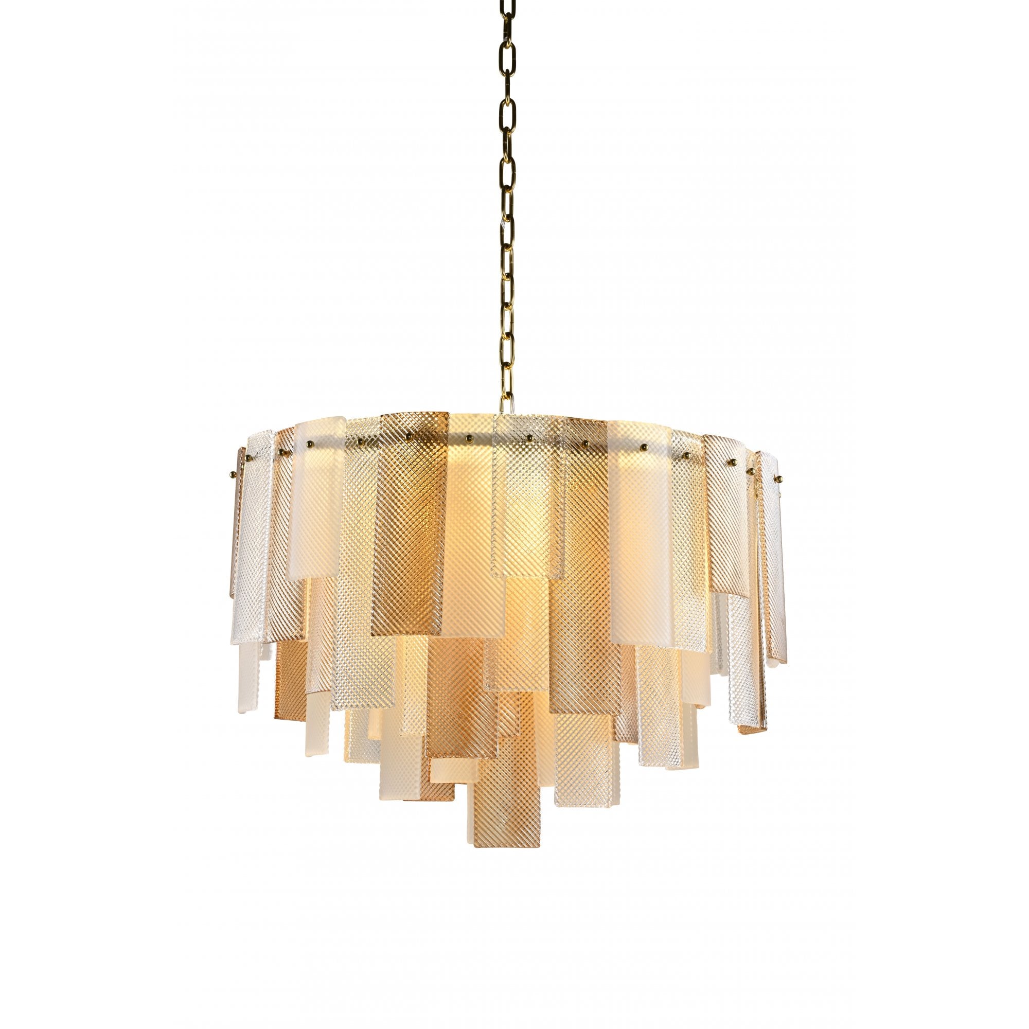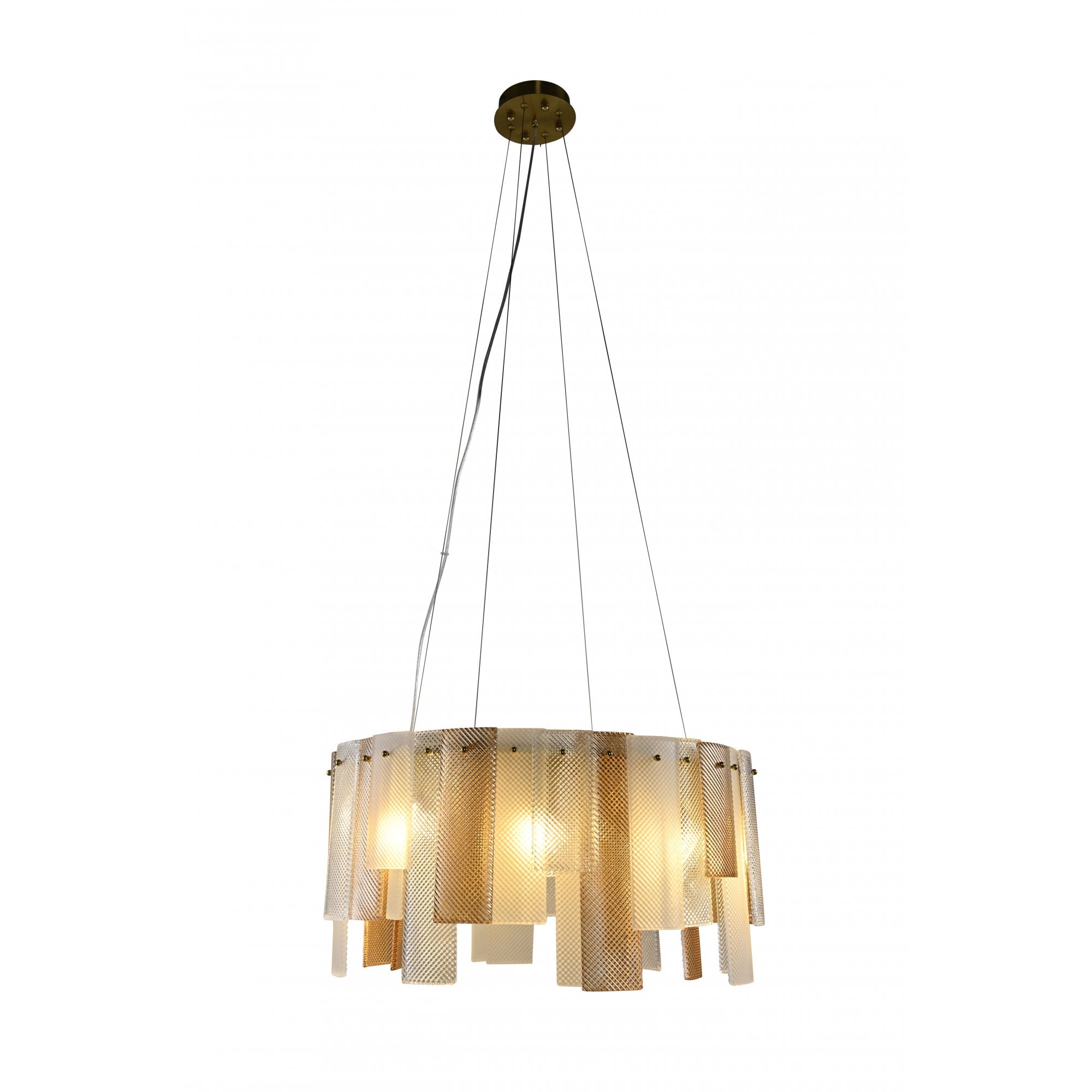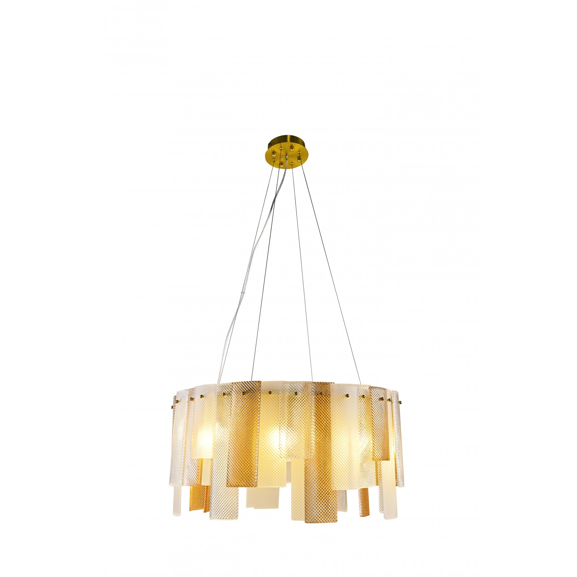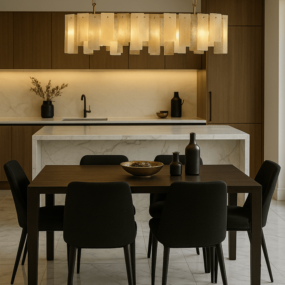 The Azzura Collection combines elegance and versatility with its striking diamond-etched glass shades in Clear, Frosted, and Cognac finishes. Each pendant is paired with a warm, luxurious gold metal frame, adding a touch of glamour to any interior. The intricate etched detailing enhances light diffusion, casting subtle reflections for a soft, atmospheric glow.