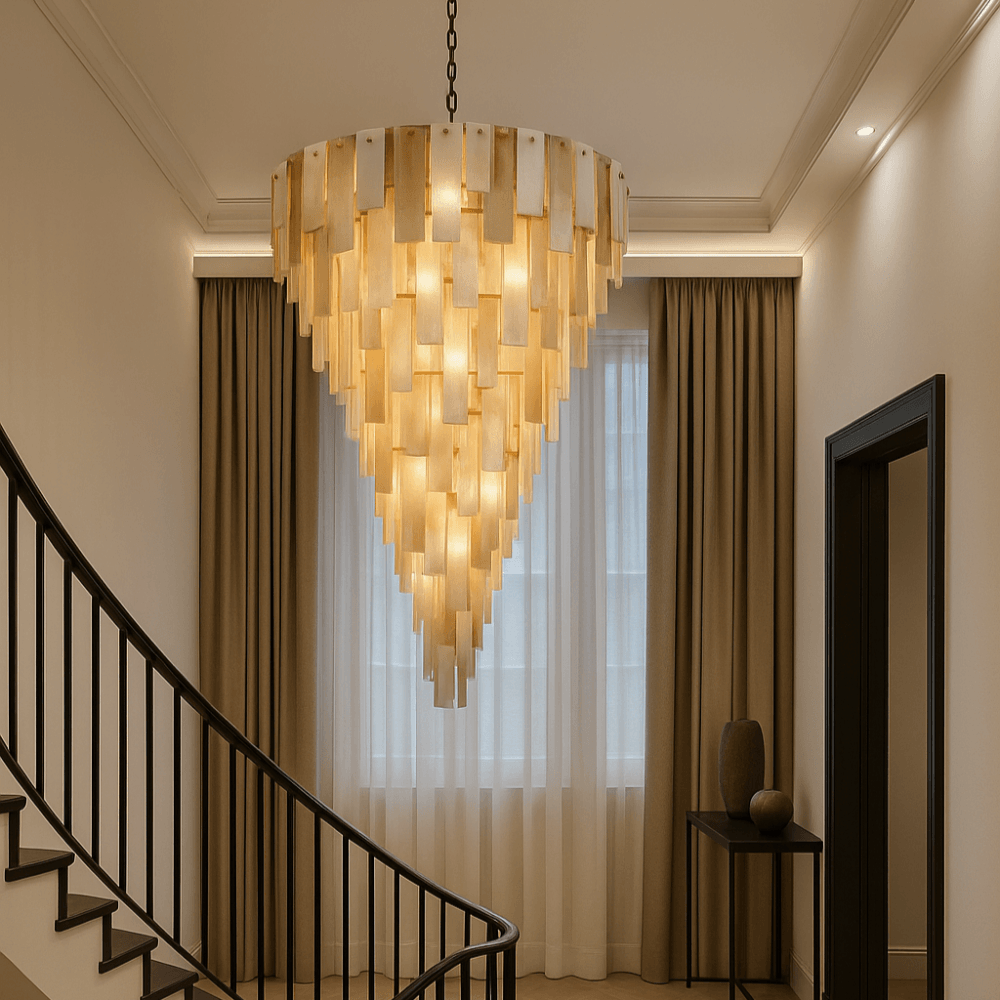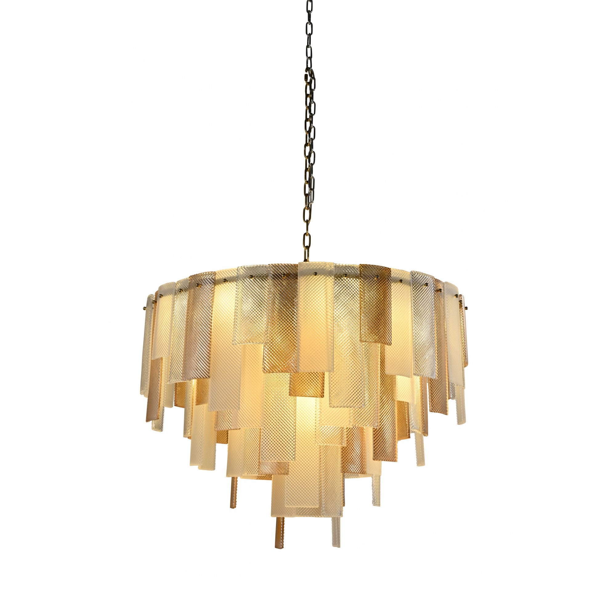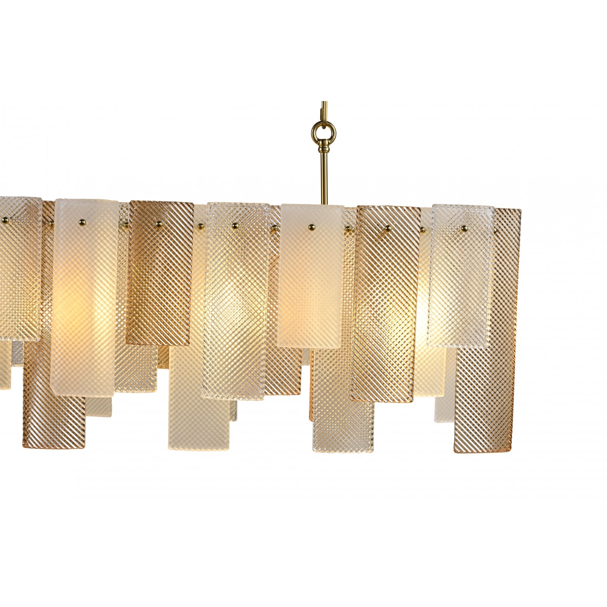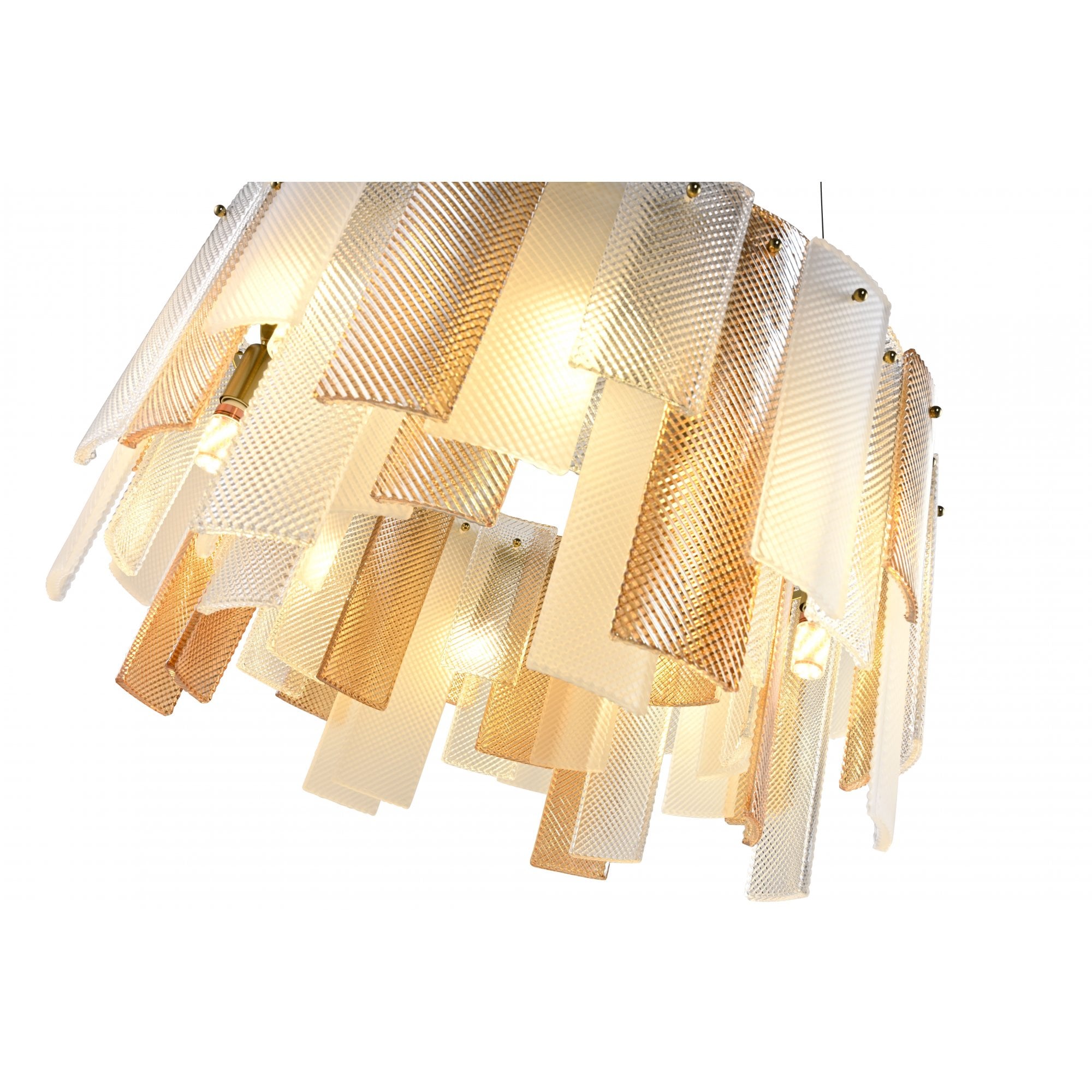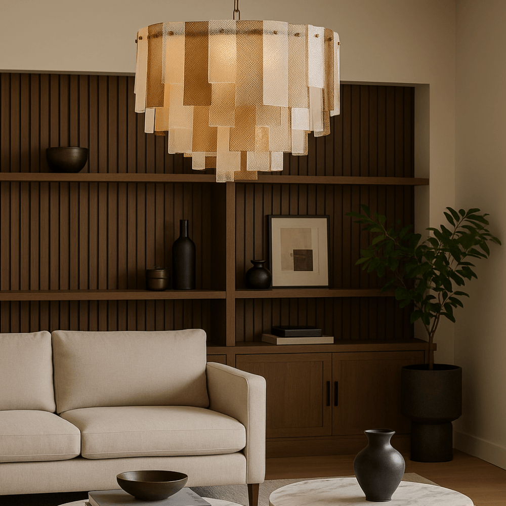 The Azzura Collection combines elegance and versatility with its striking diamond-etched glass shades in Clear, Frosted, and Cognac finishes. Each pendant is paired with a warm, luxurious gold metal frame, adding a touch of glamour to any interior. The intricate etched detailing enhances light diffusion, casting subtle reflections for a soft, atmospheric glow.