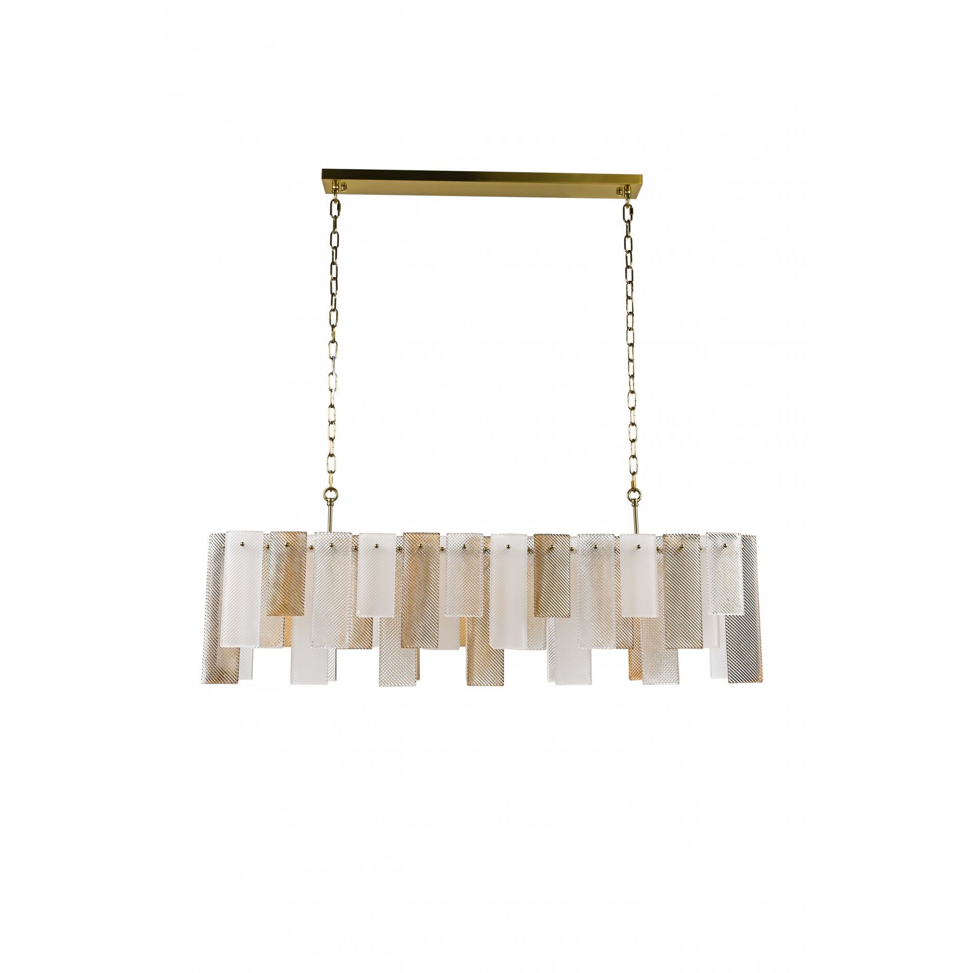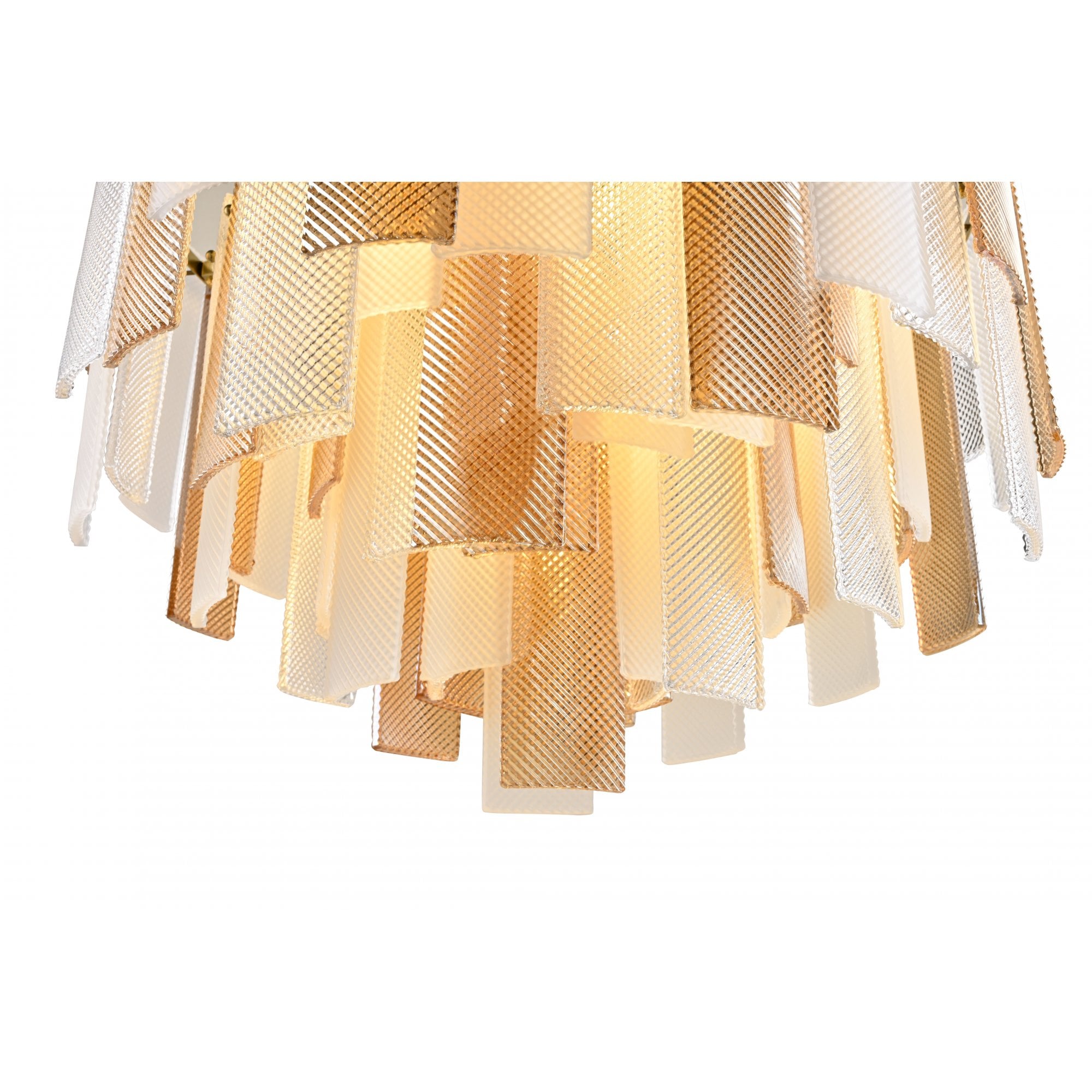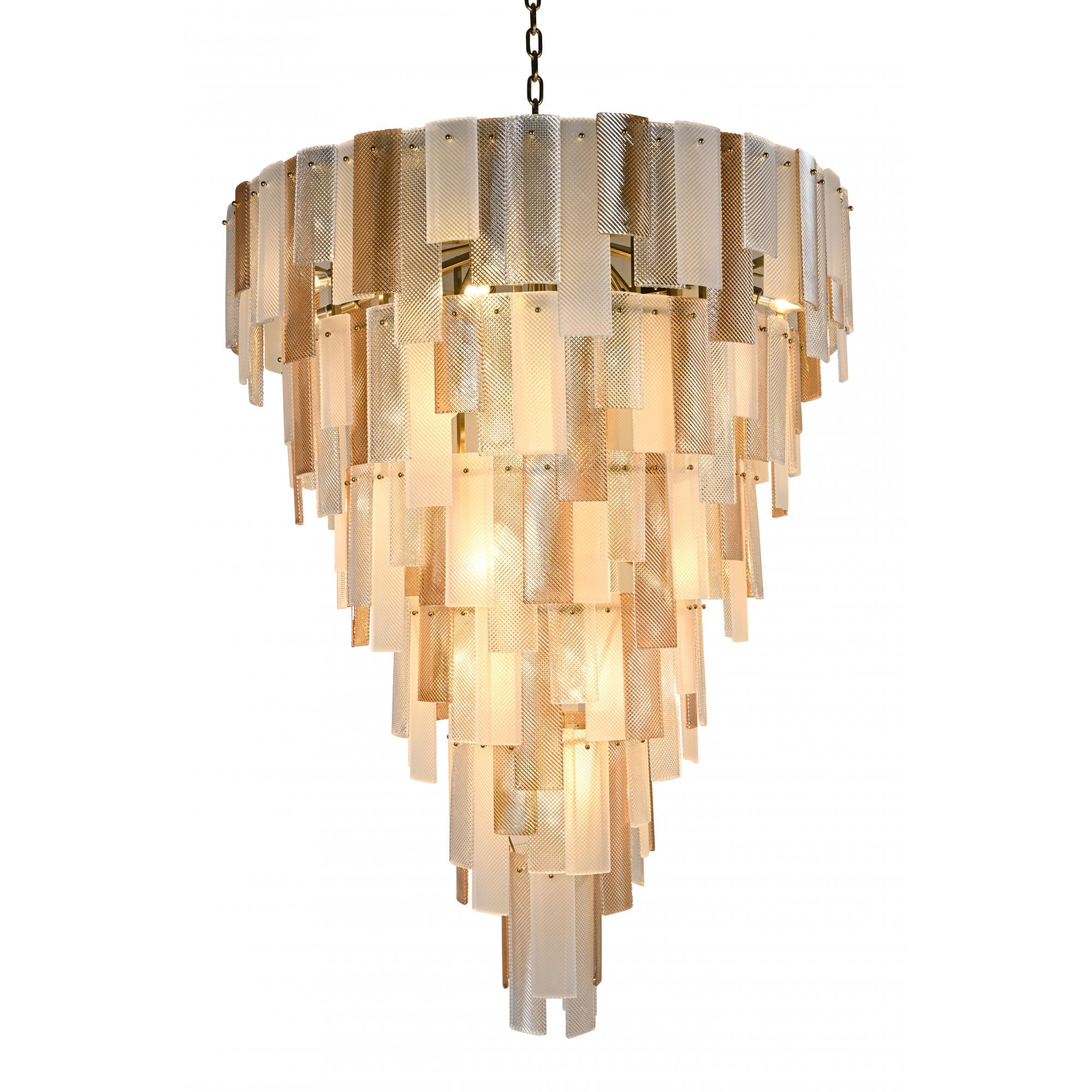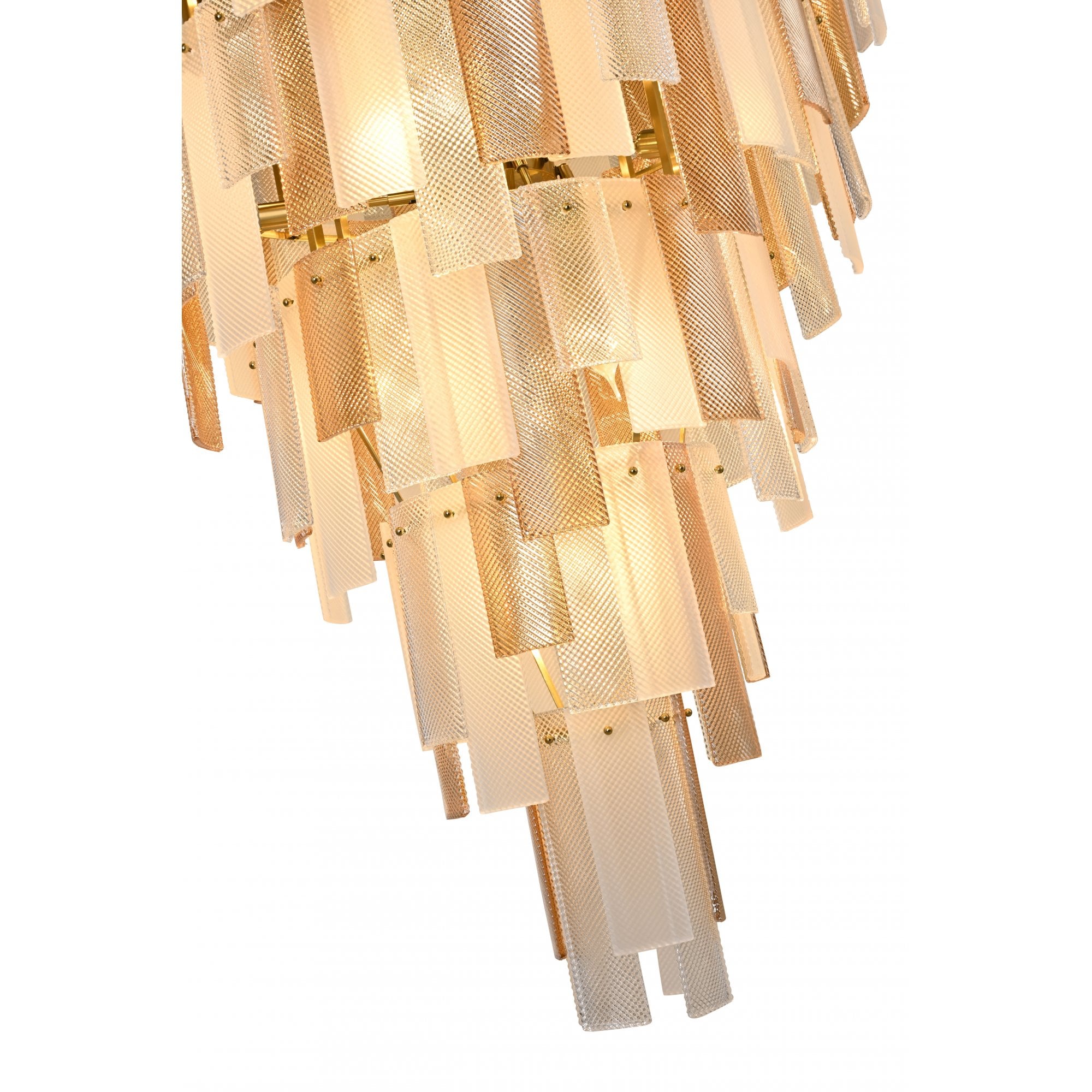 The Azzura Collection combines elegance and versatility with its striking diamond-etched glass shades in Clear, Frosted, and Cognac finishes. Each pendant is paired with a warm, luxurious gold metal frame, adding a touch of glamour to any interior. The intricate etched detailing enhances light diffusion, casting subtle reflections for a soft, atmospheric glow.