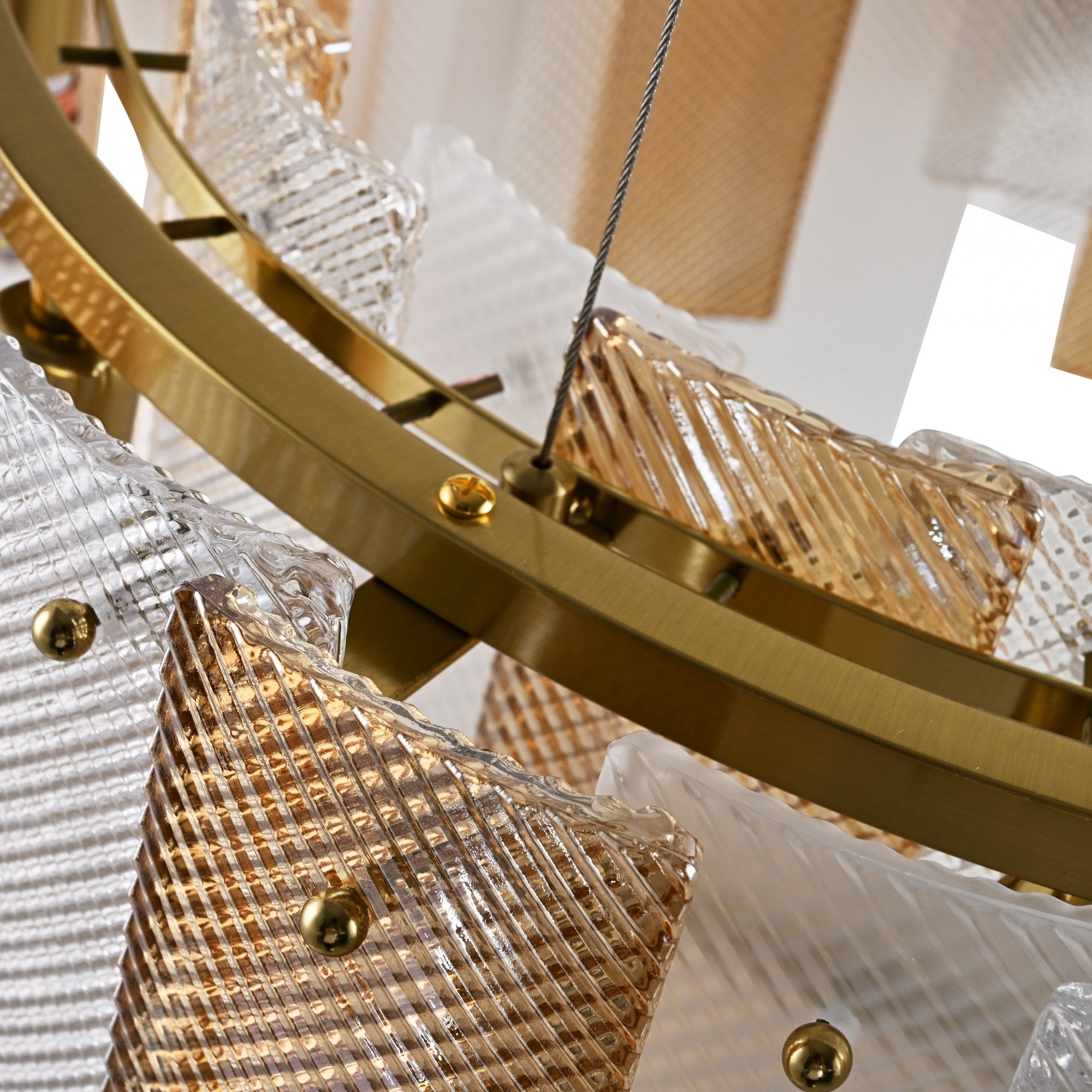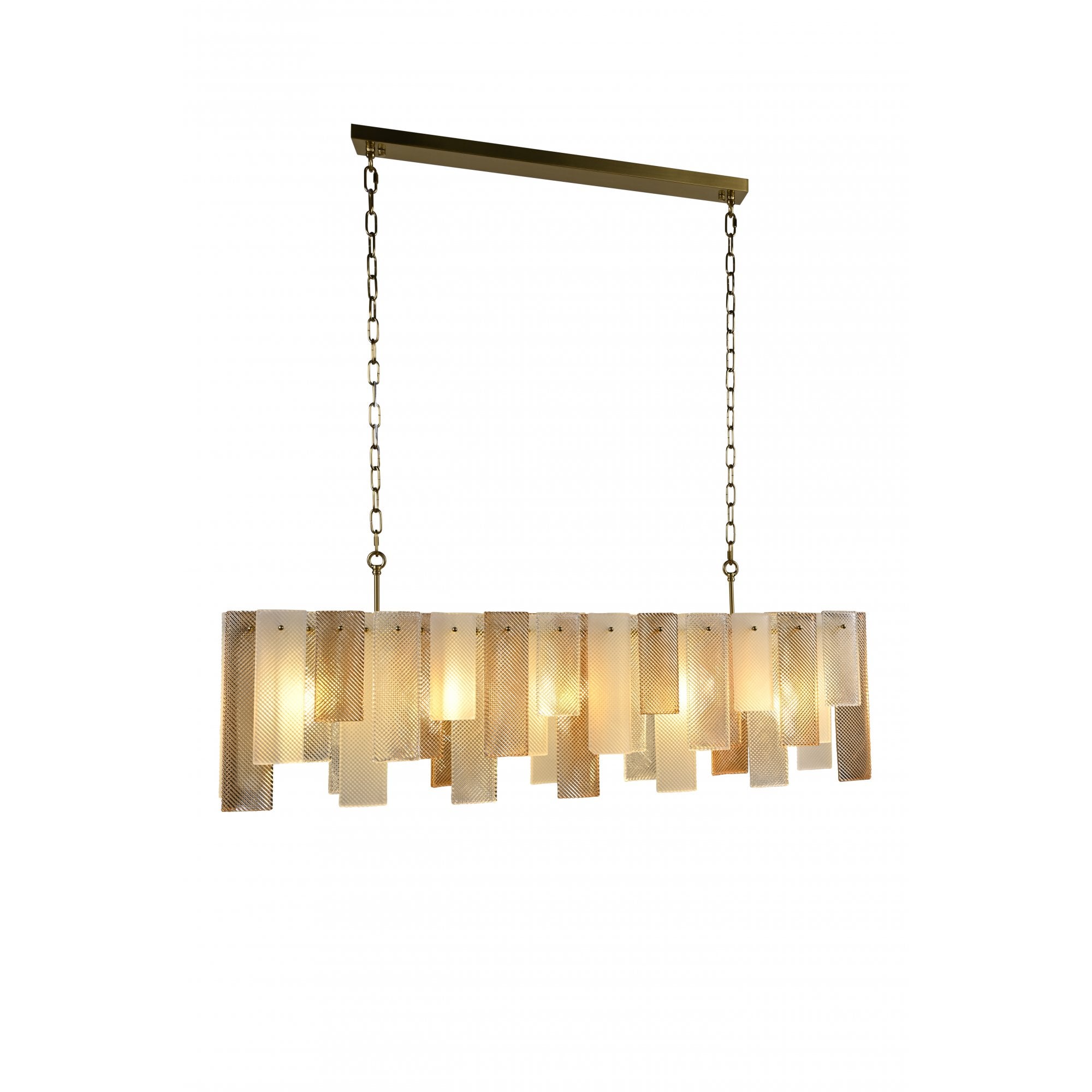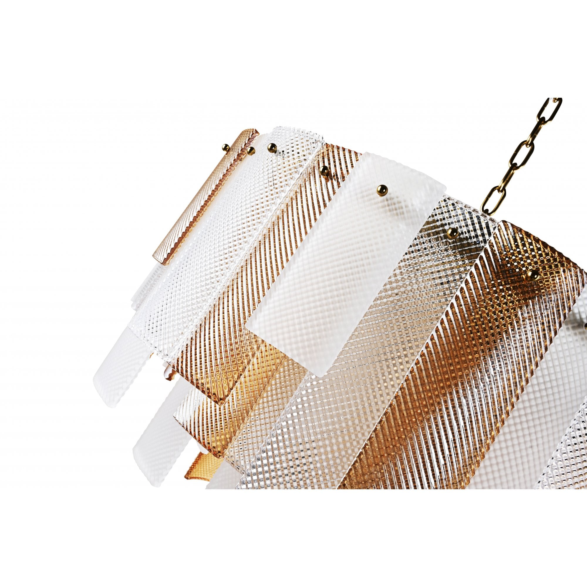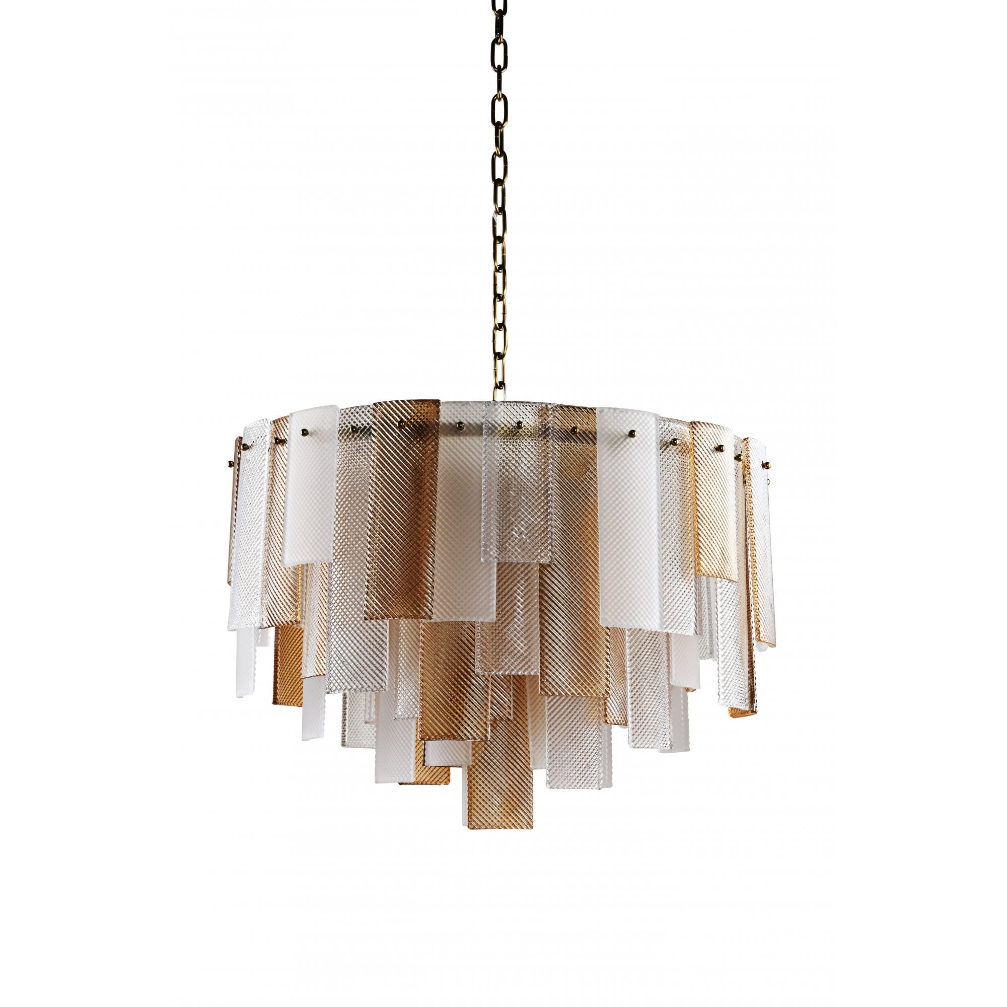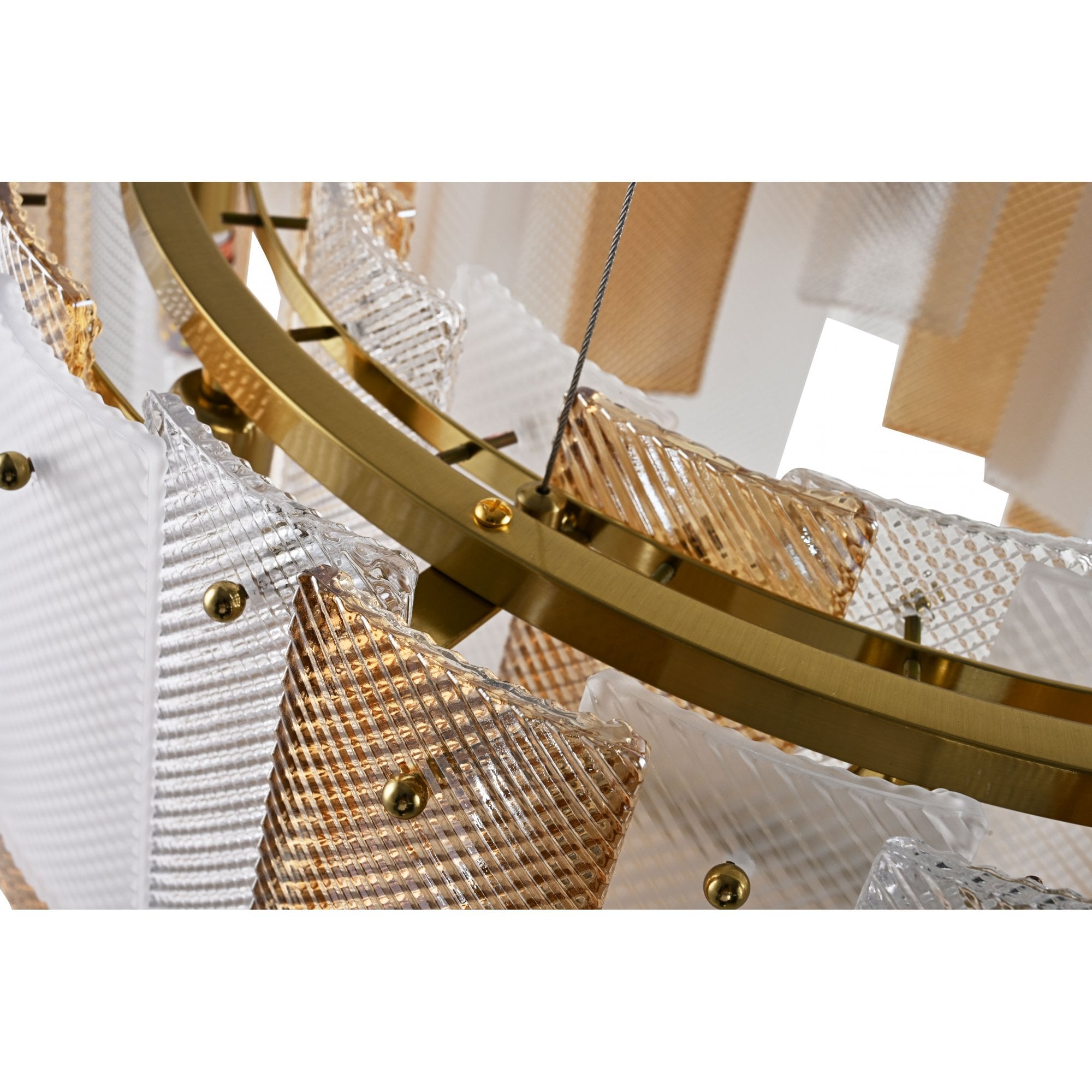 The Azzura Collection combines elegance and versatility with its striking diamond-etched glass shades in Clear, Frosted, and Cognac finishes. Each pendant is paired with a warm, luxurious gold metal frame, adding a touch of glamour to any interior. The intricate etched detailing enhances light diffusion, casting subtle reflections for a soft, atmospheric glow.