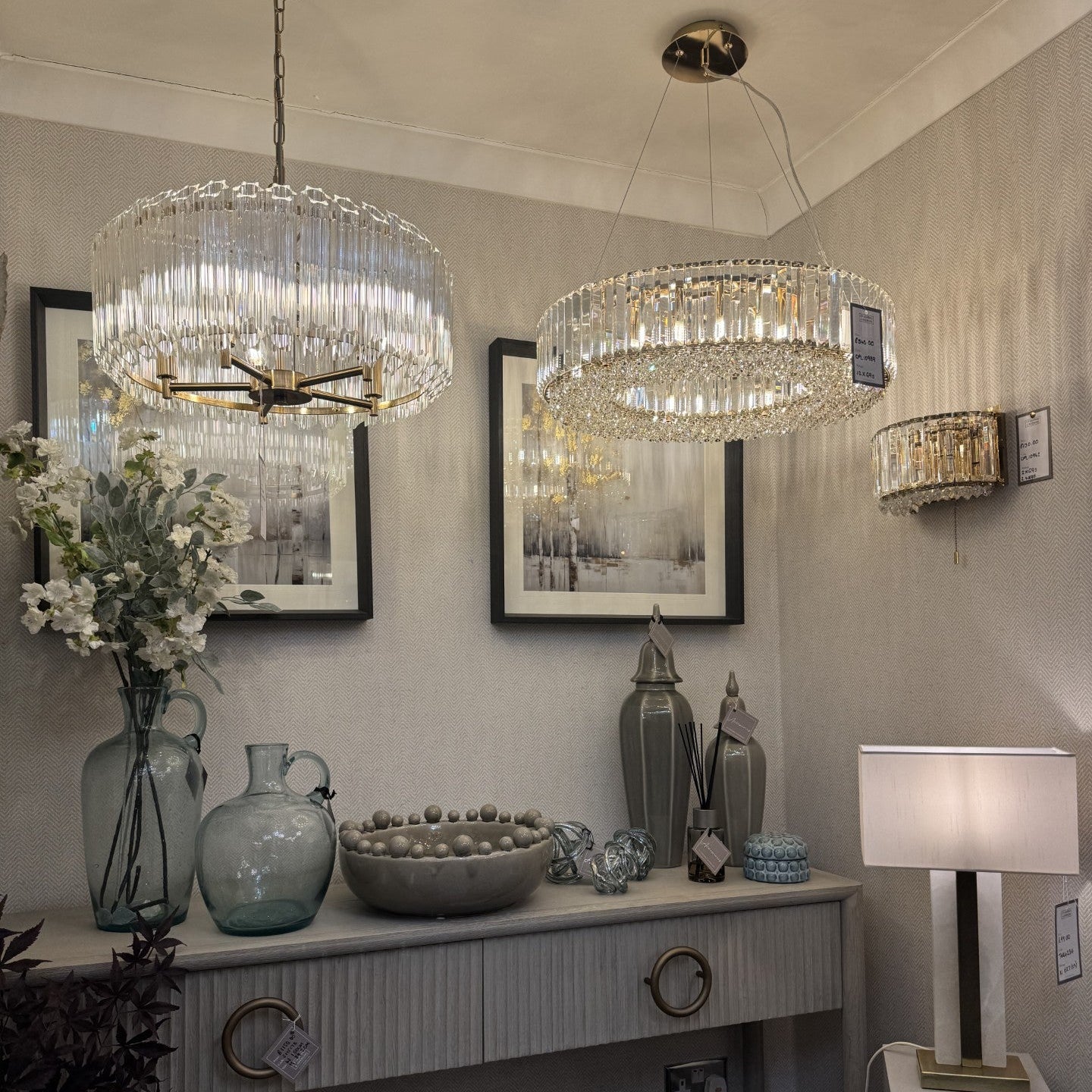 Our showroom contains a collection of stunning lighting, furniture, soft furnishings, clocks, mirrors home scents, accessories and more!