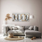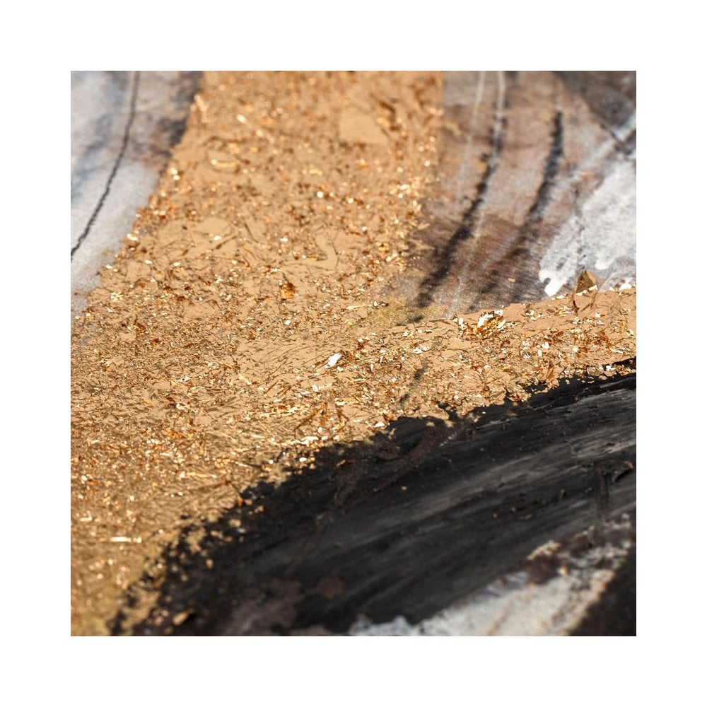 The Oil on Canvas 18 has a neutral, gold and black swirl detail. Hand finished with gold foil for a bold statement to any interior wall.