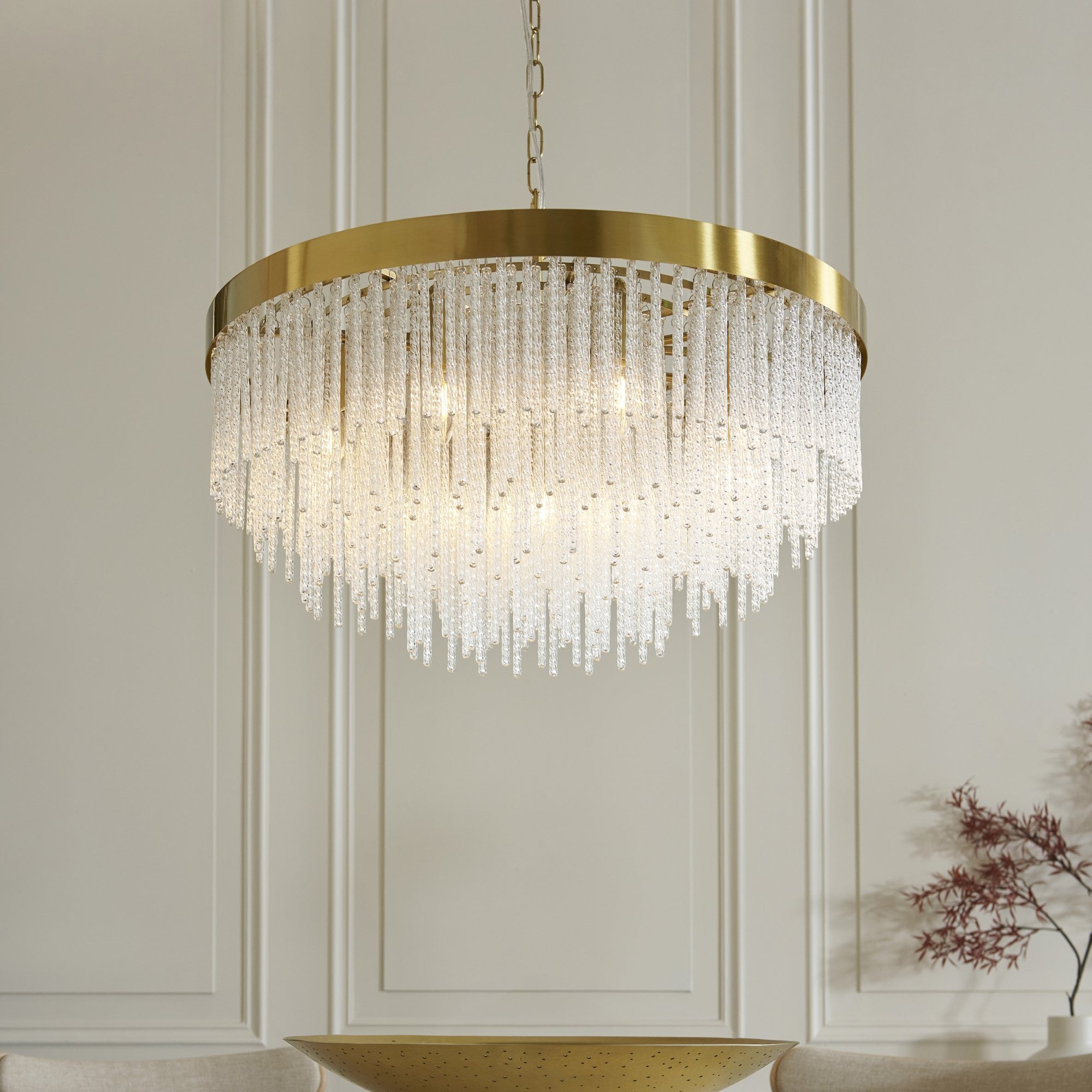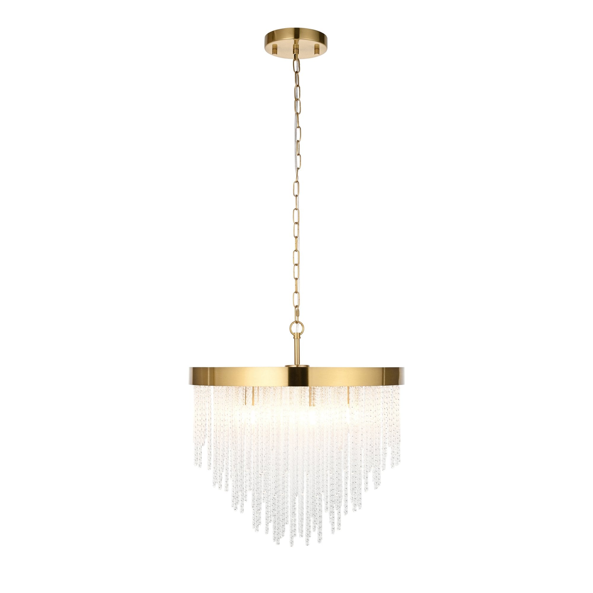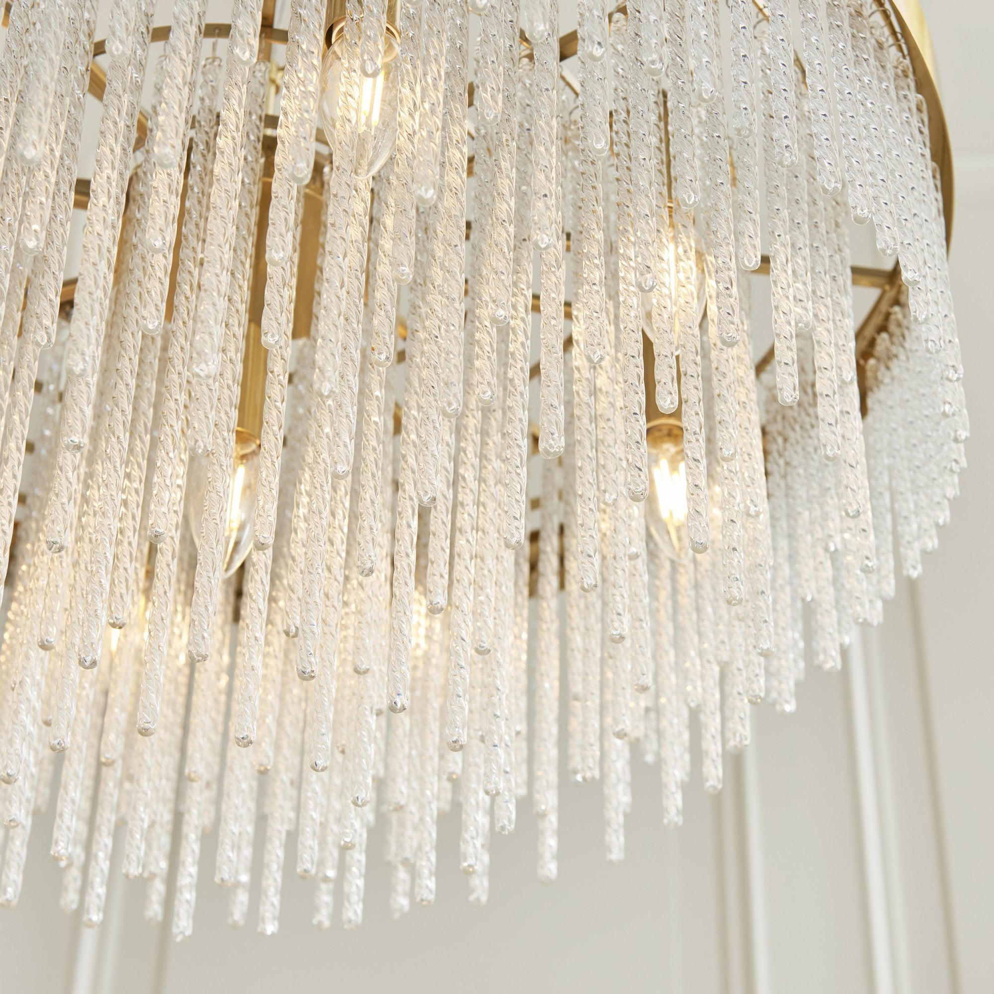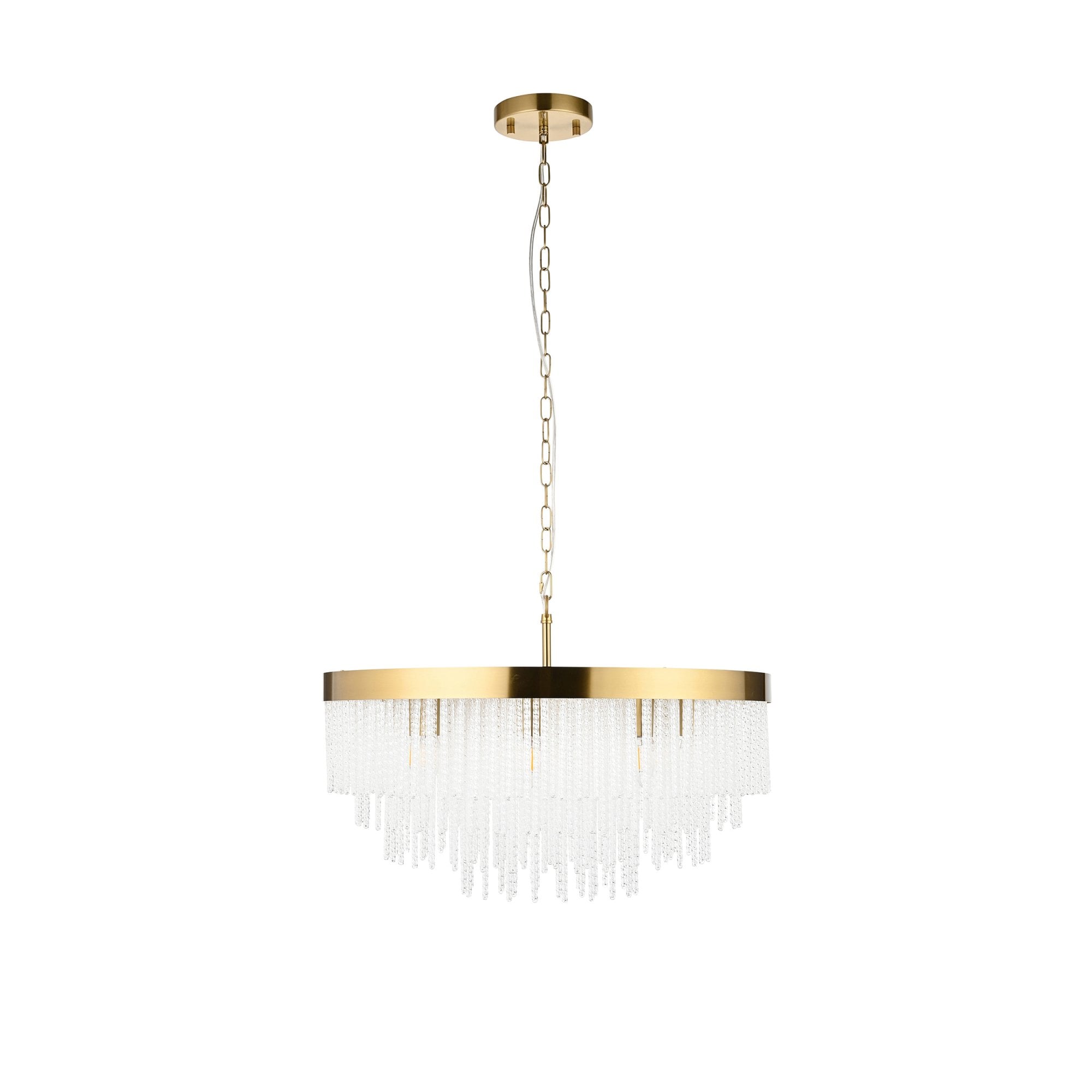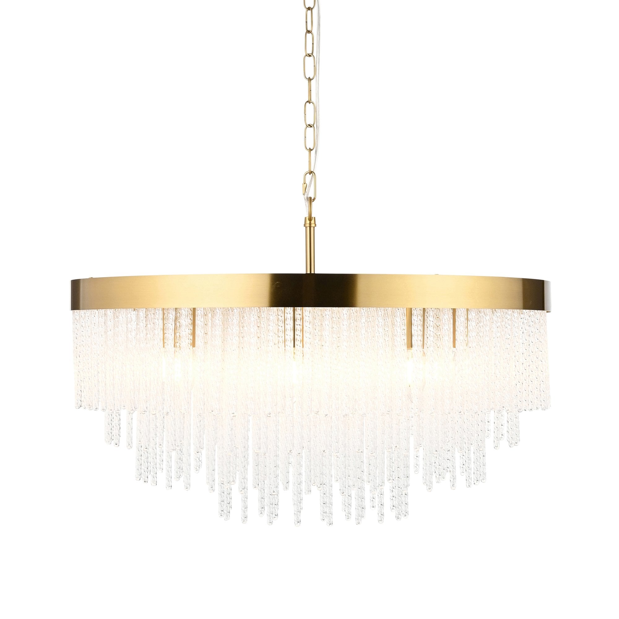 Make a bold design statement with this stunning collection. Showcasing a luxurious warm brass-finished frame and an intricate arrangement of textured glass rods, this fixture exudes glamour and elegance. The generous scale and cascading silhouette create a dramatic focal point, ideal for dining rooms, stairwells, lounges, bedrooms and entryways. It delivers brilliant illumination while the shimmering glass details add depth and sophistication to any interior.