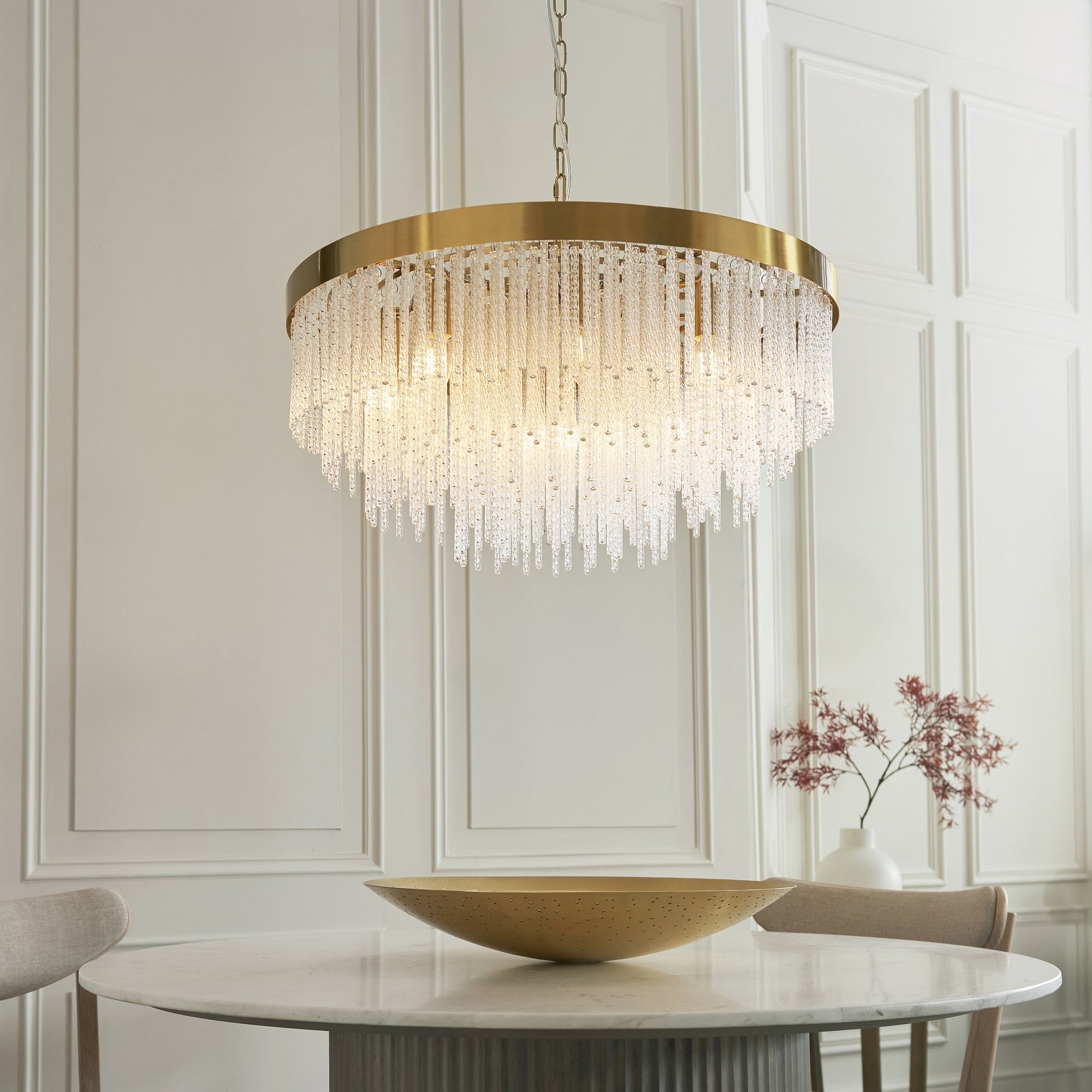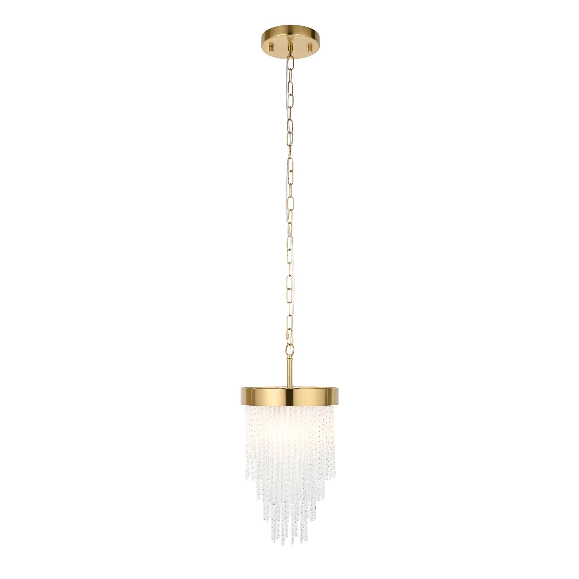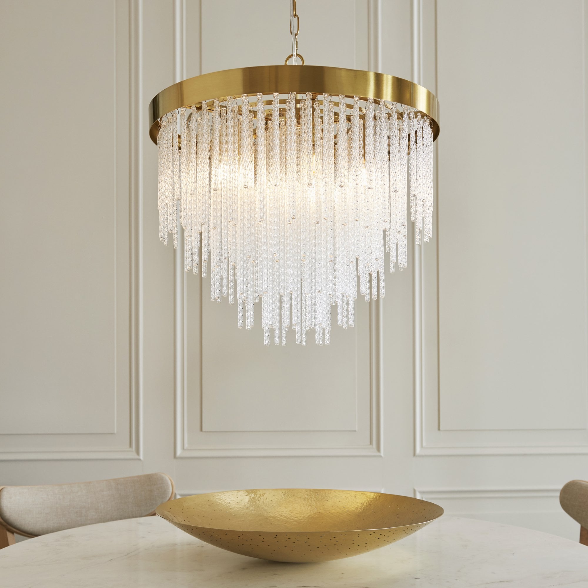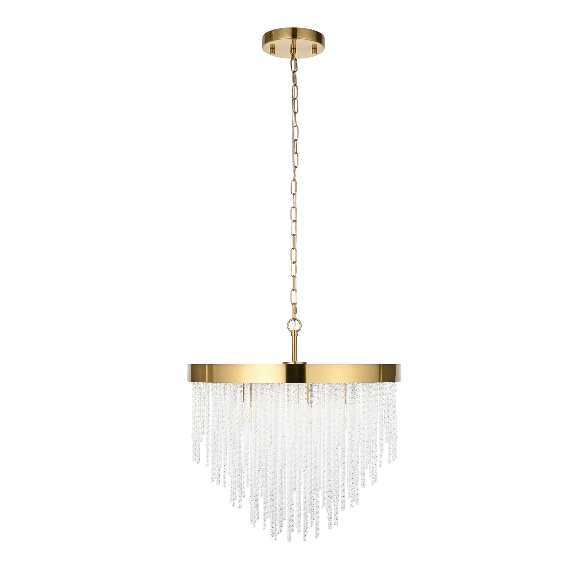 Make a bold design statement with this stunning collection. Showcasing a luxurious warm brass-finished frame and an intricate arrangement of textured glass rods, this fixture exudes glamour and elegance. The generous scale and cascading silhouette create a dramatic focal point, ideal for dining rooms, stairwells, lounges, bedrooms and entryways. It delivers brilliant illumination while the shimmering glass details add depth and sophistication to any interior.