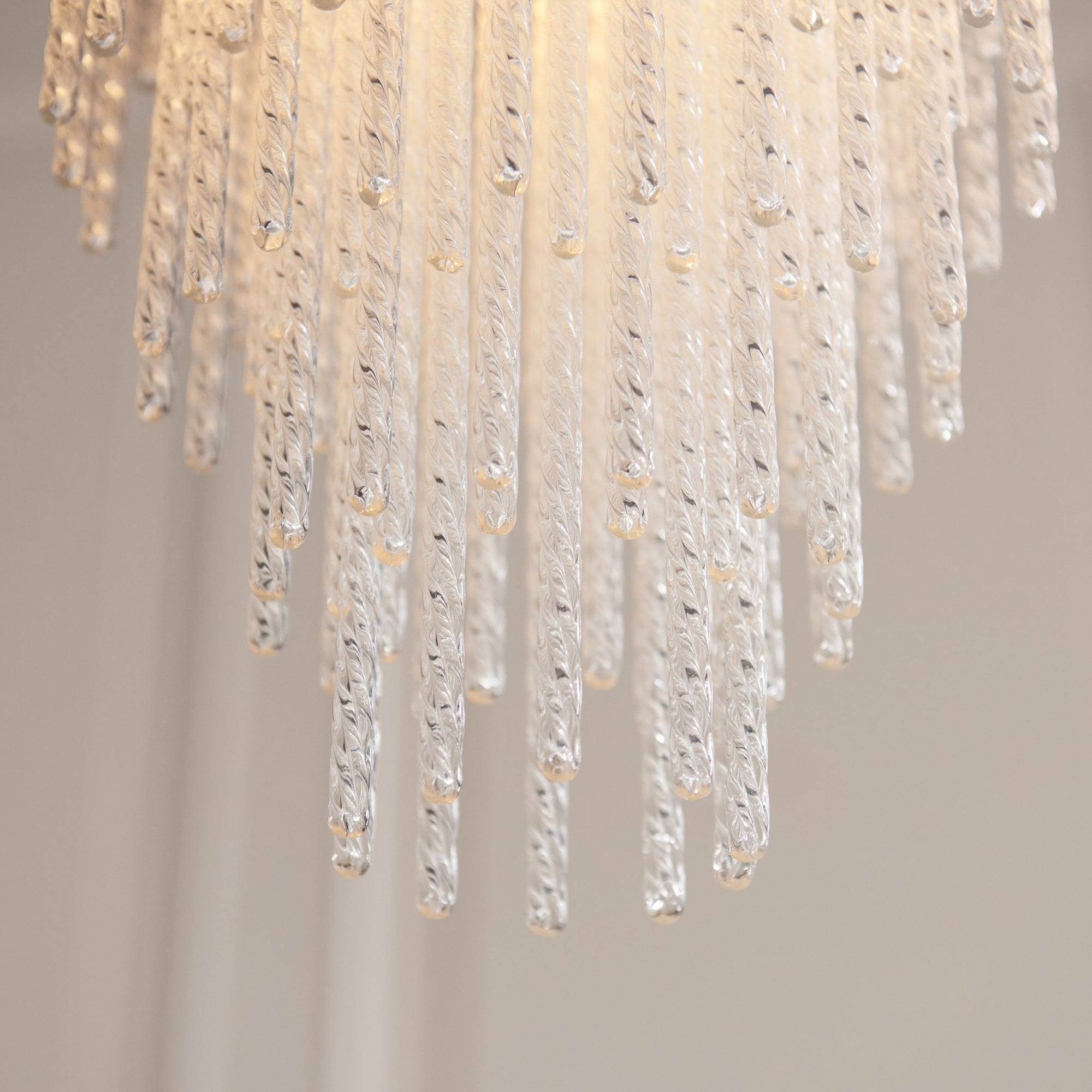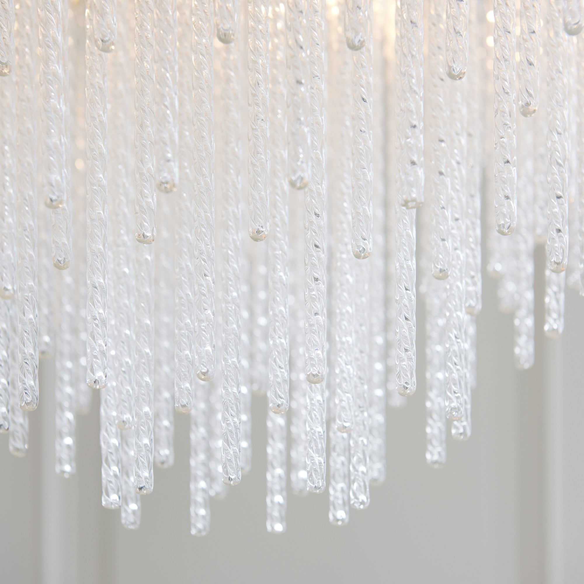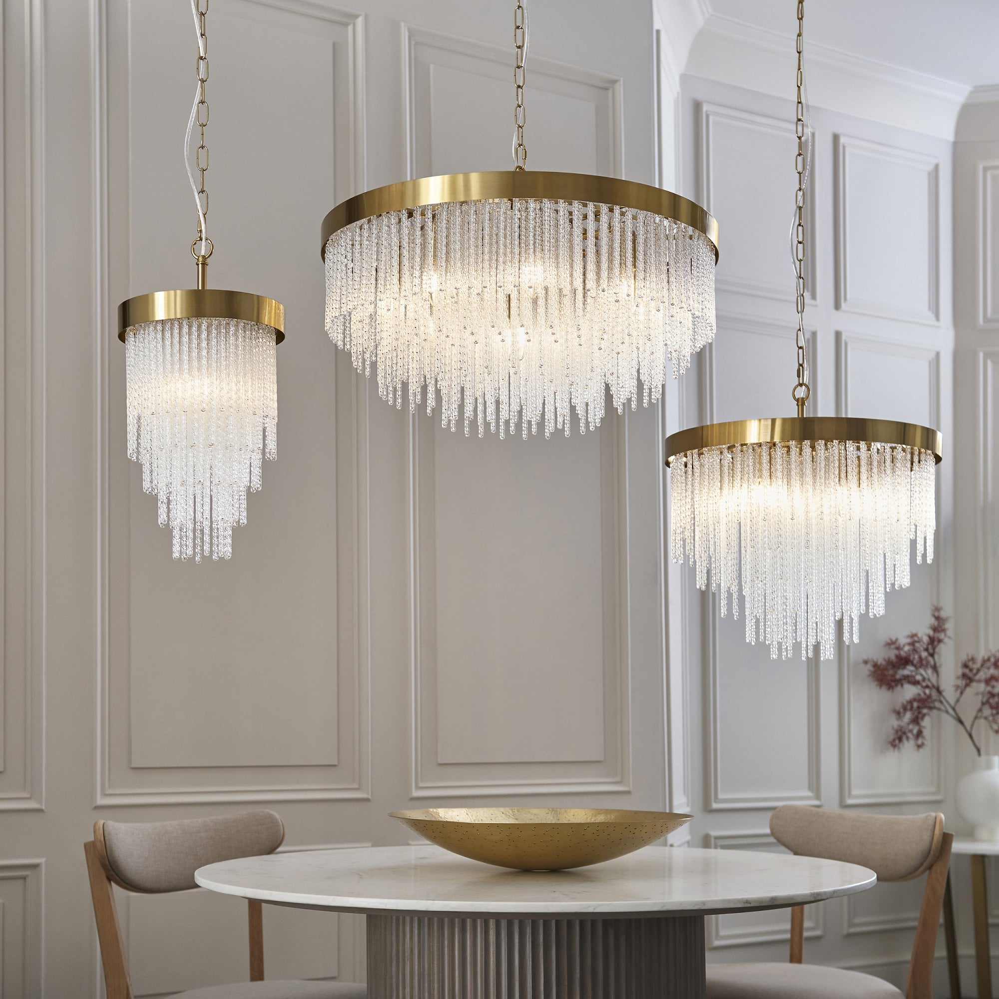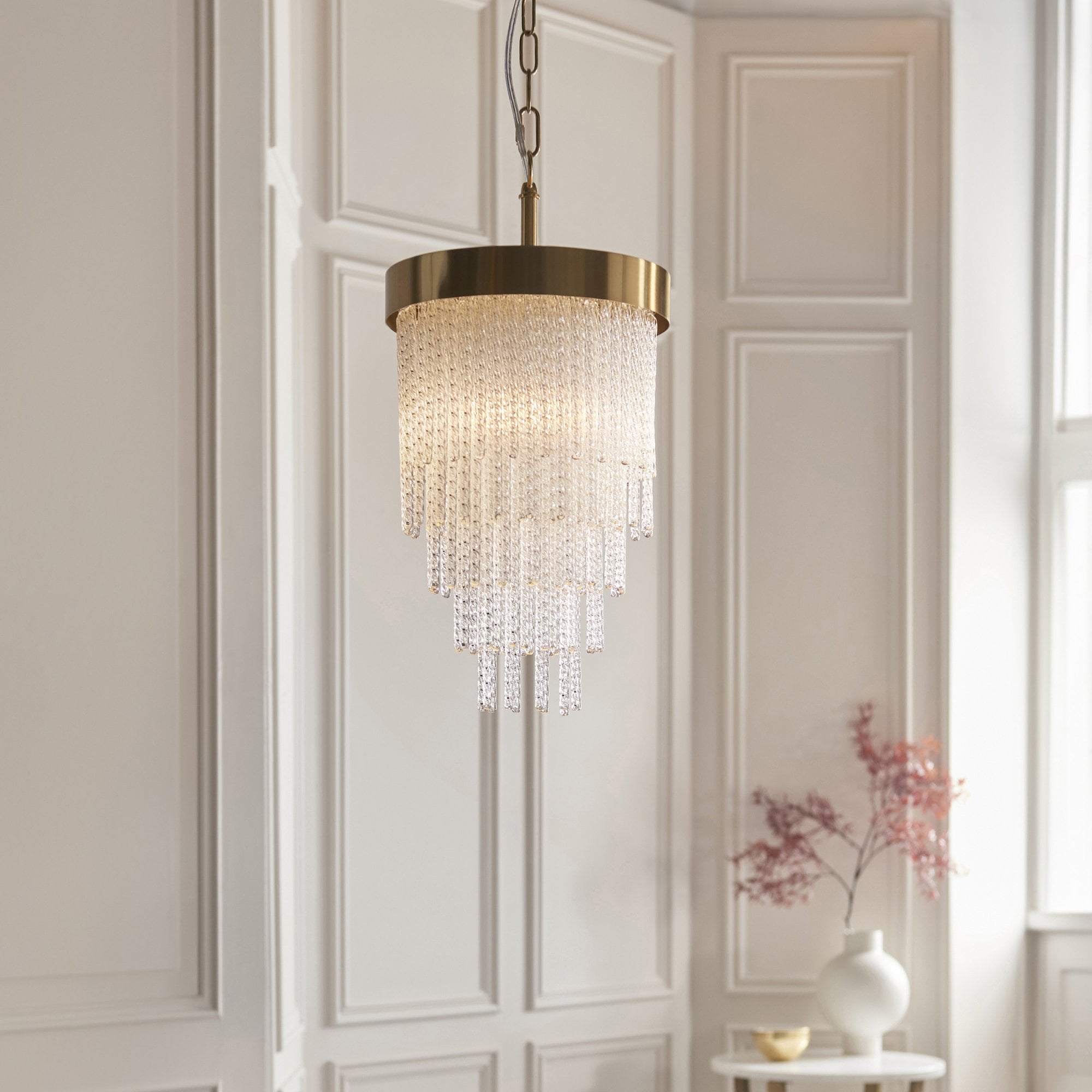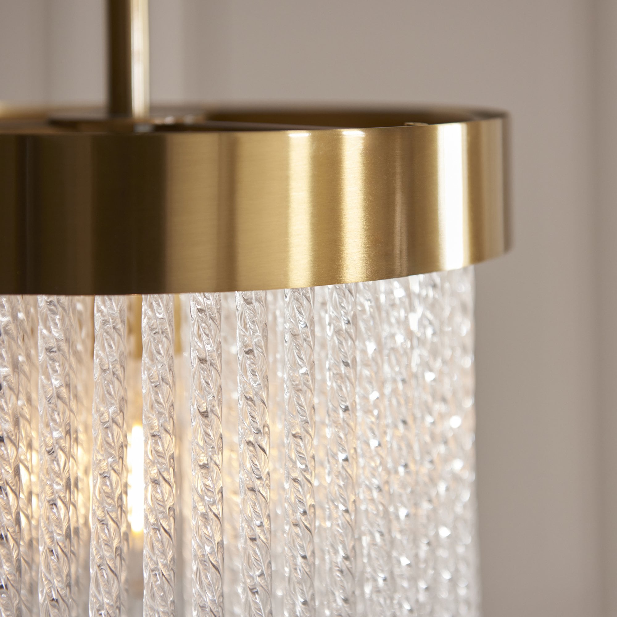 Make a bold design statement with this stunning collection. Showcasing a luxurious warm brass-finished frame and an intricate arrangement of textured glass rods, this fixture exudes glamour and elegance. The generous scale and cascading silhouette create a dramatic focal point, ideal for dining rooms, stairwells, lounges, bedrooms and entryways. It delivers brilliant illumination while the shimmering glass details add depth and sophistication to any interior.