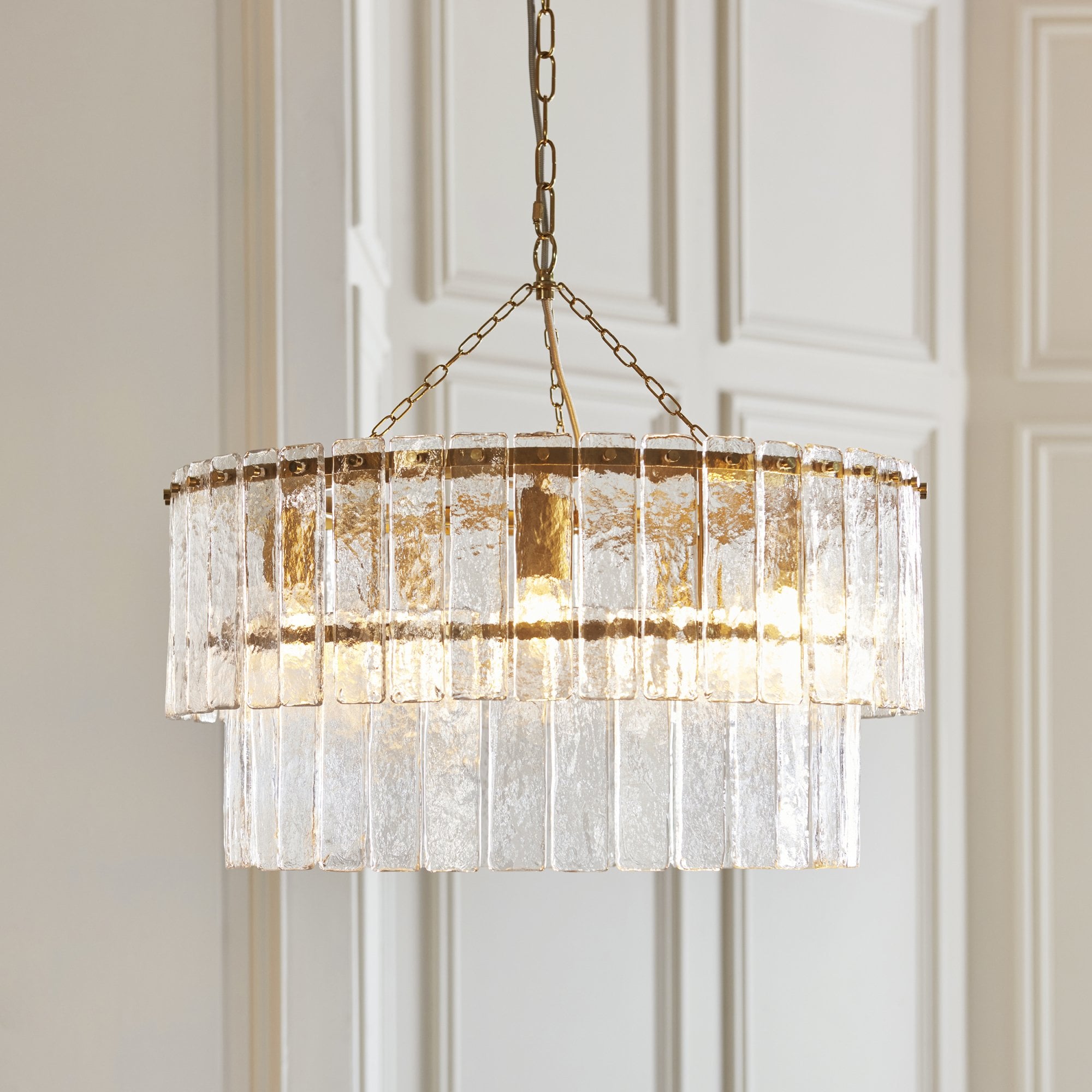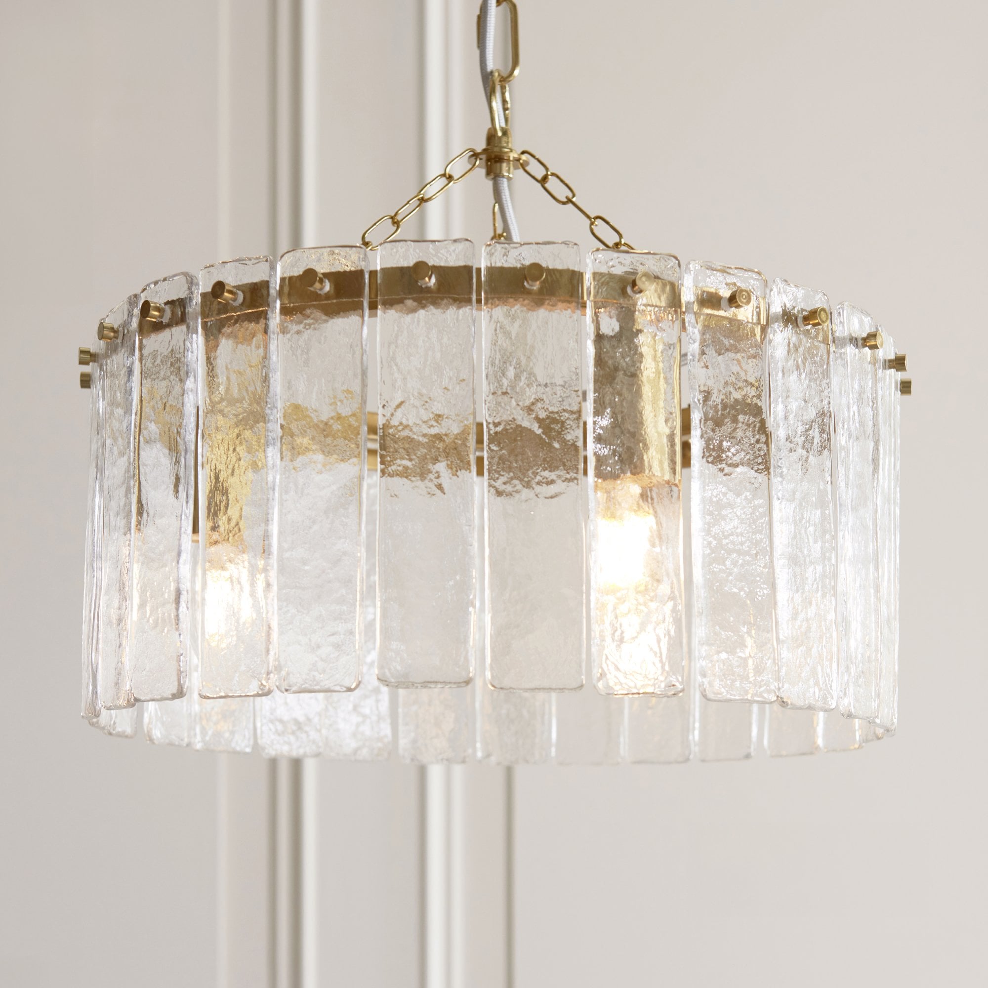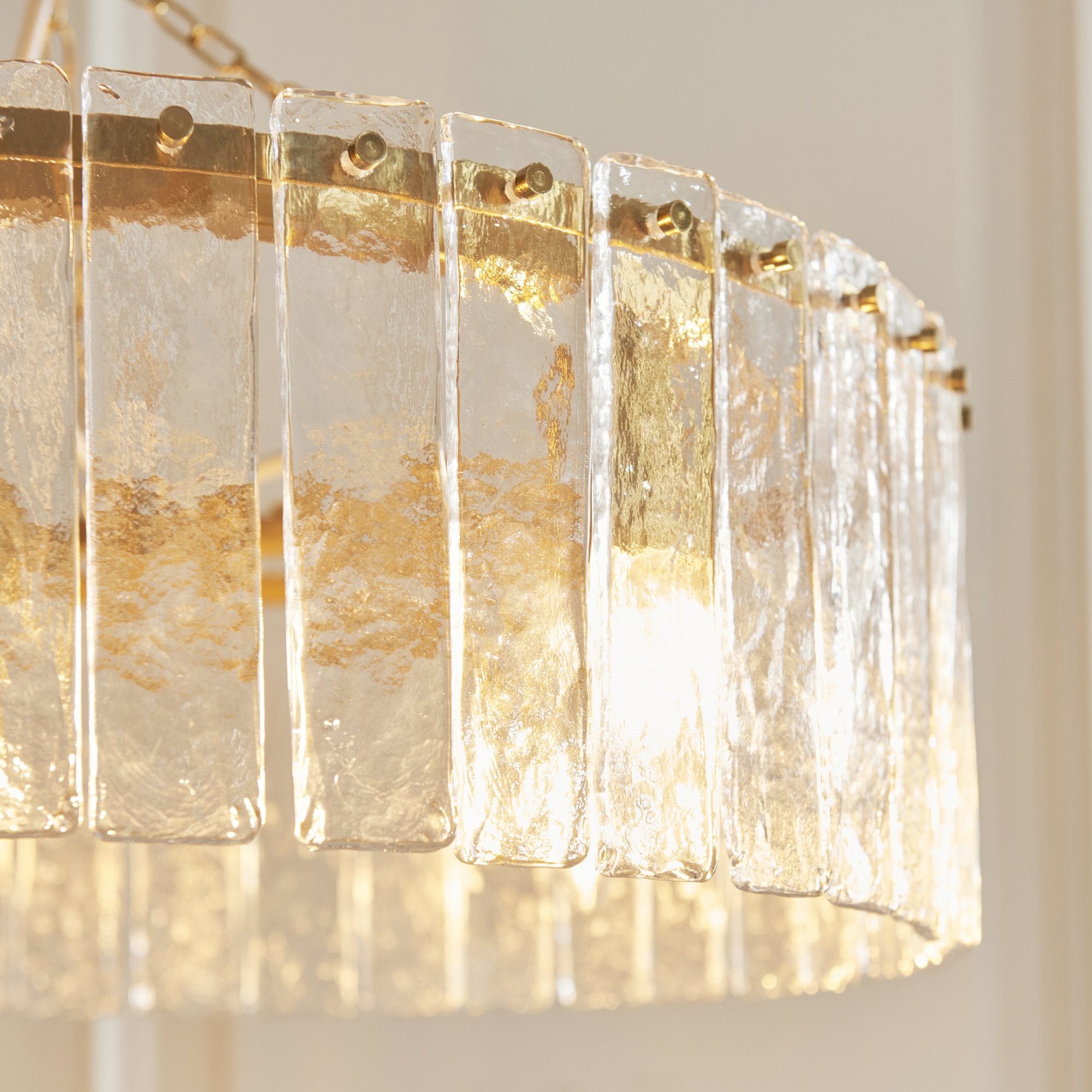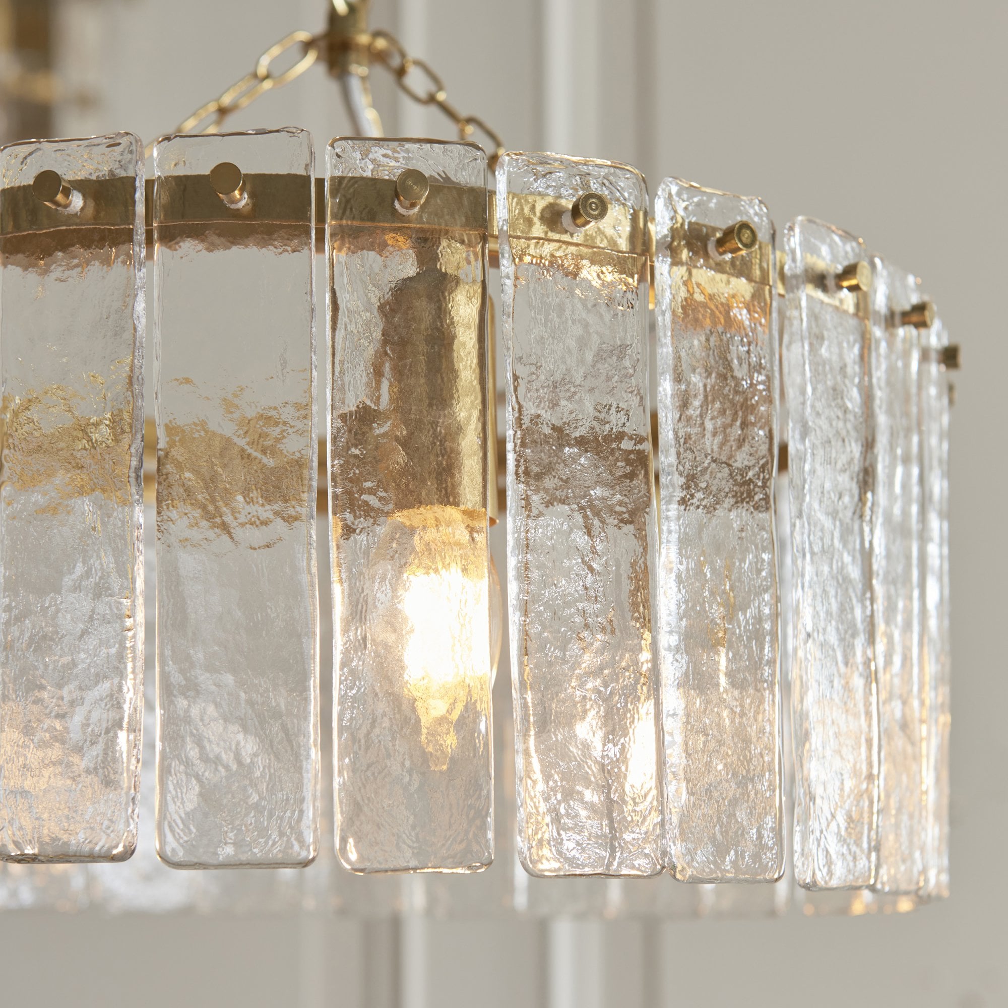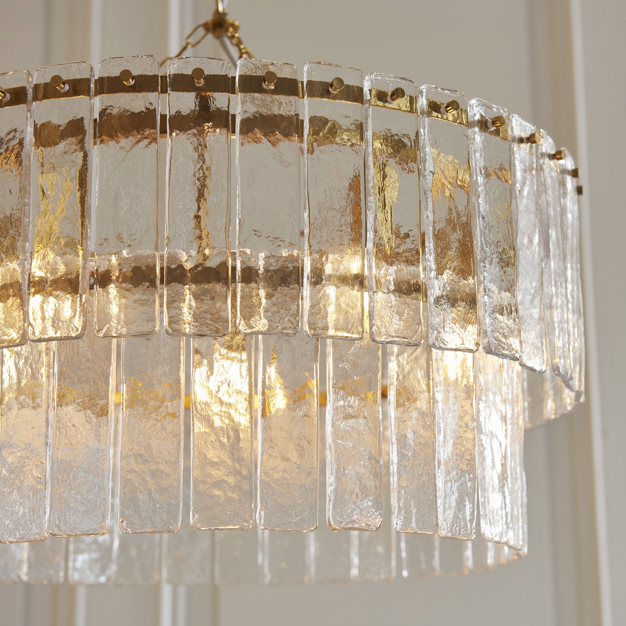 Inspired by vintage Venetian art lighting and rich in texture this collection features a layered arrangement of handmade glass panels that shimmer with natural variation and depth. Each piece is uniquely formed, casting soft, refracted light while adding sculptural interest to the wall. Framed by a warm metallic finish, this elegant fixture is perfect for illuminating hallways, or enhancing sophisticated living spaces or bedrooms.