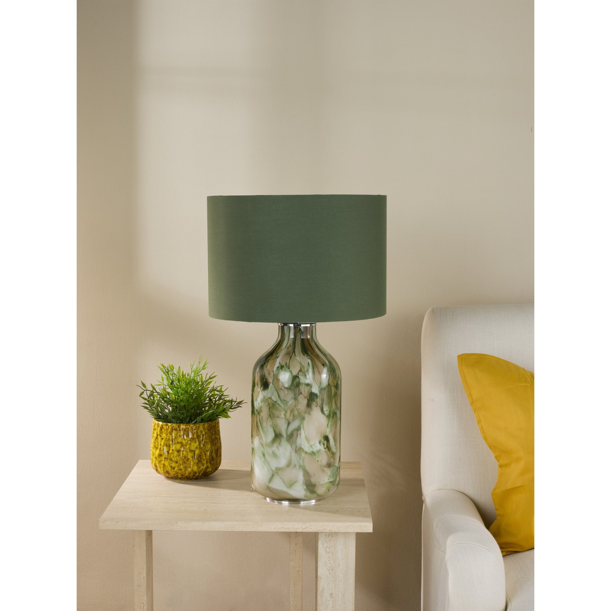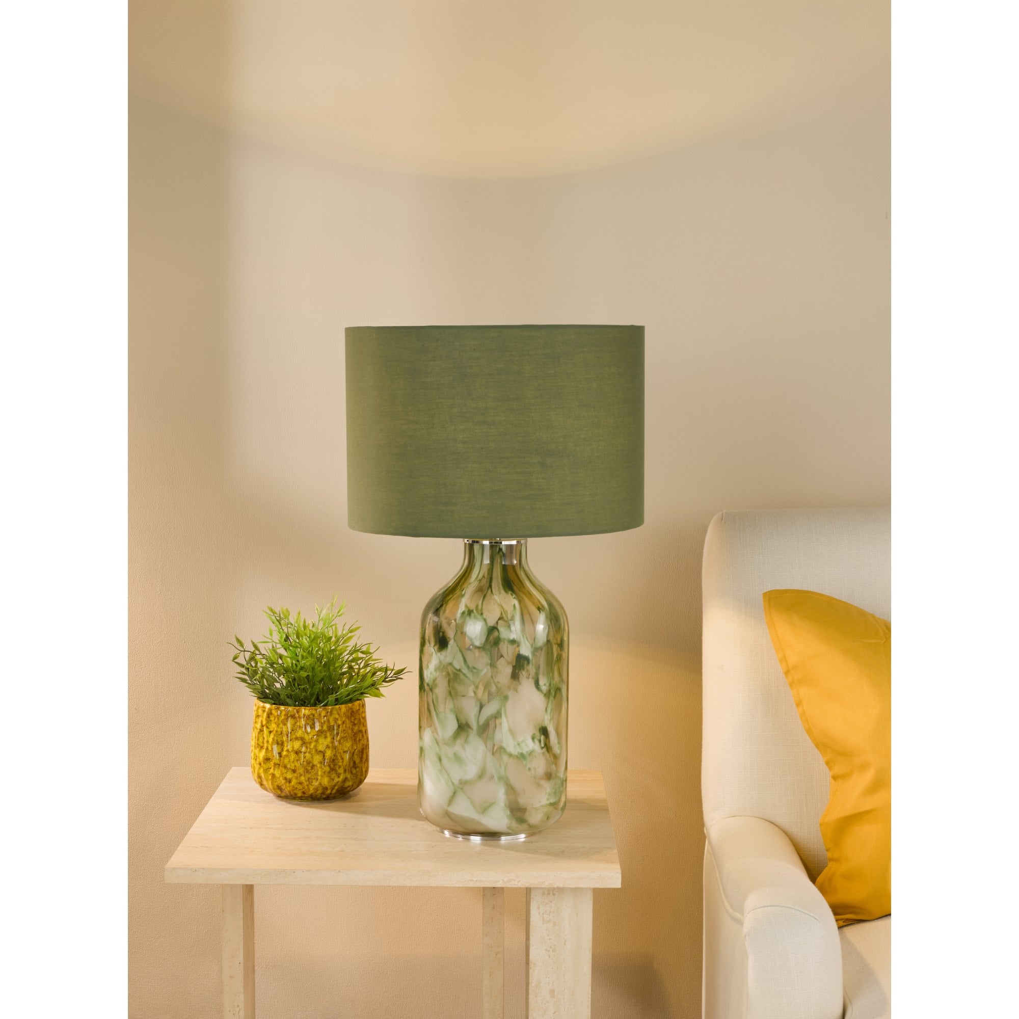 The Nuria Table Lamp is a statement piece that brings artistry and individuality to interiors. Its hand-finished Art Glass base swirls with variegated greens, each one unique with shifting highlights that catch the light beautifully. A cotton-rich shade in matching green, lined with tonal fabric, enhances the depth of colour, while a polished chrome stem and luxury green braided cable complete the design. Perfect for living rooms, bedrooms, hallways or open-plan spaces, the Nuria adds colour, character and sophistication to any scheme.