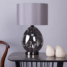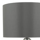 The QUINN table light pendant has an organically shaped, mouth-blown spherical glass base with oversized dimples, in a lightly smoked finish. Paired with bright polished chrome finish metalwork and a sheened fabric shade in grey, this is a unique and striking table lamp that looks great from every angle.