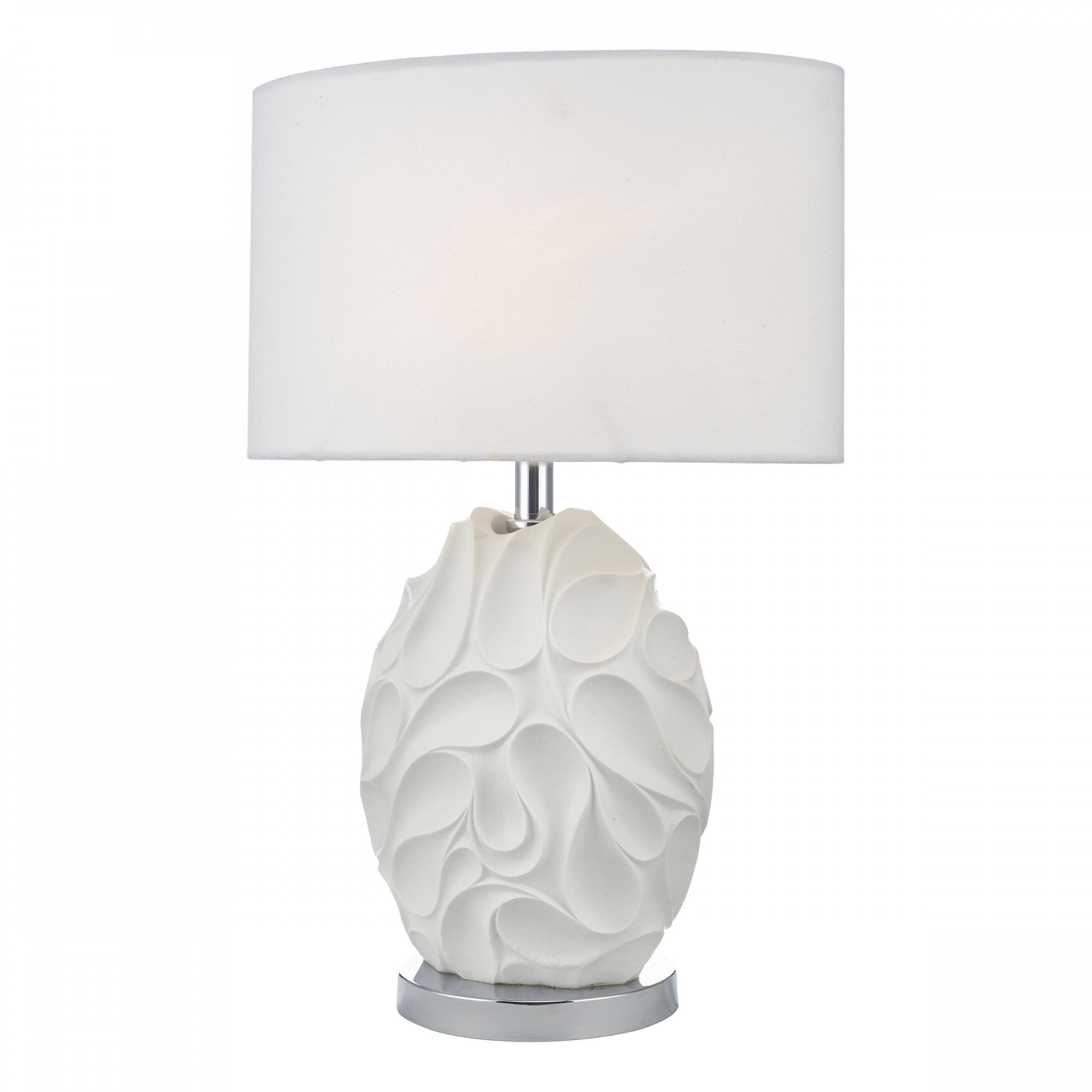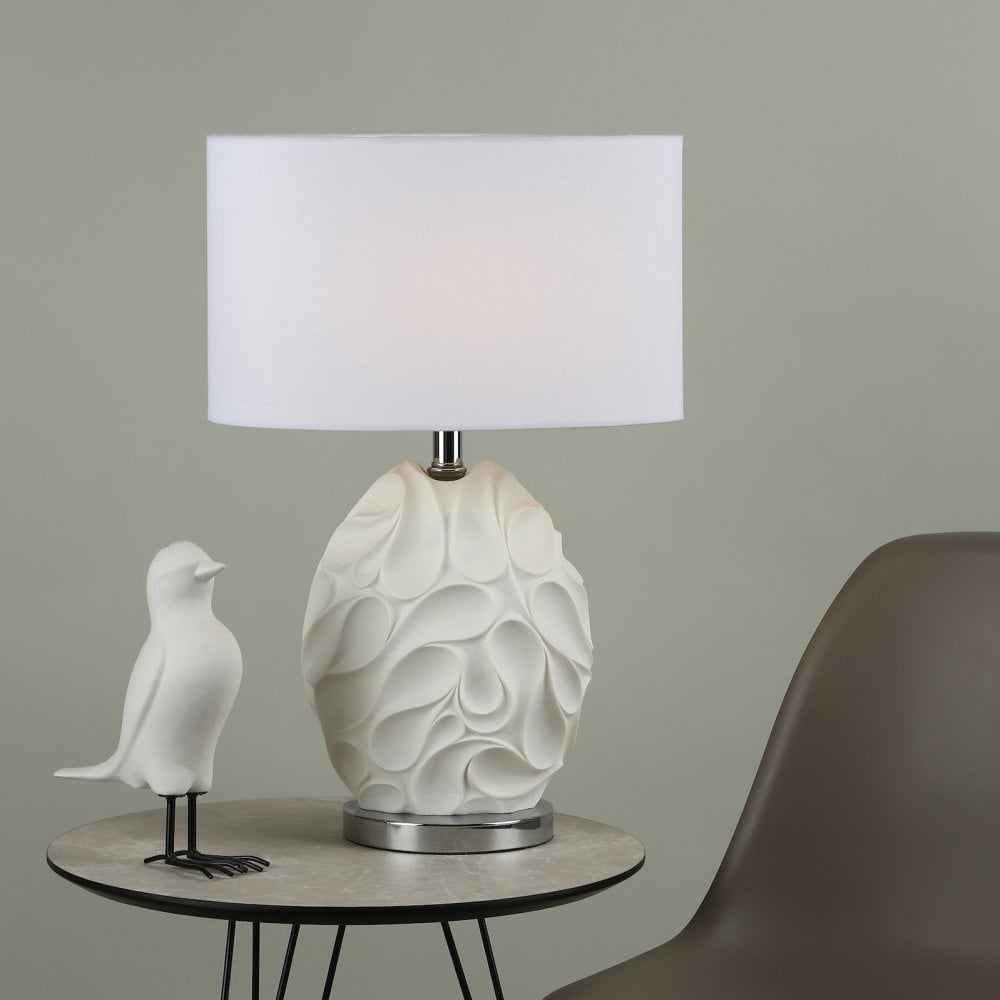 Zachary is a sculptured oval table lamp with a dramatic undulating texture with peaks and troughs balanced by the matt white painted finish, revealing subtle curved shadows. With bright polished chrome detailing at the base and neck, this lamp is paired with a complementary oval off-white linen shade.