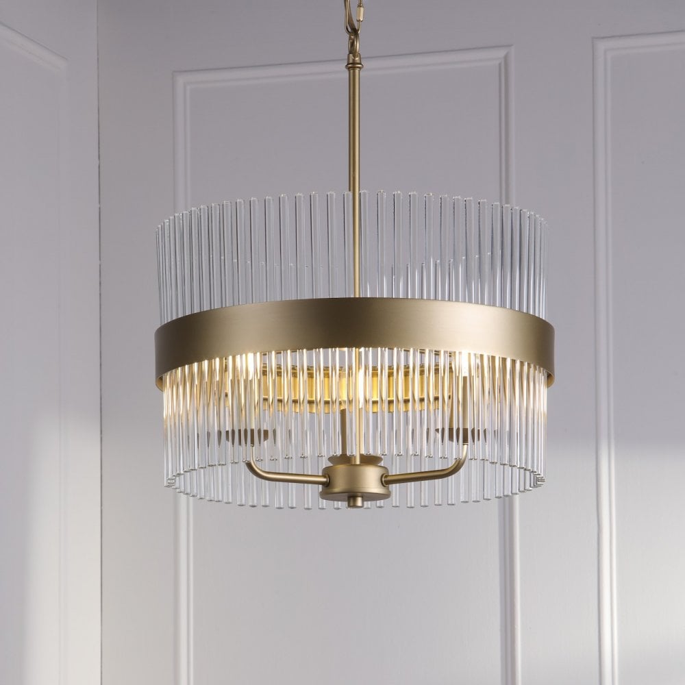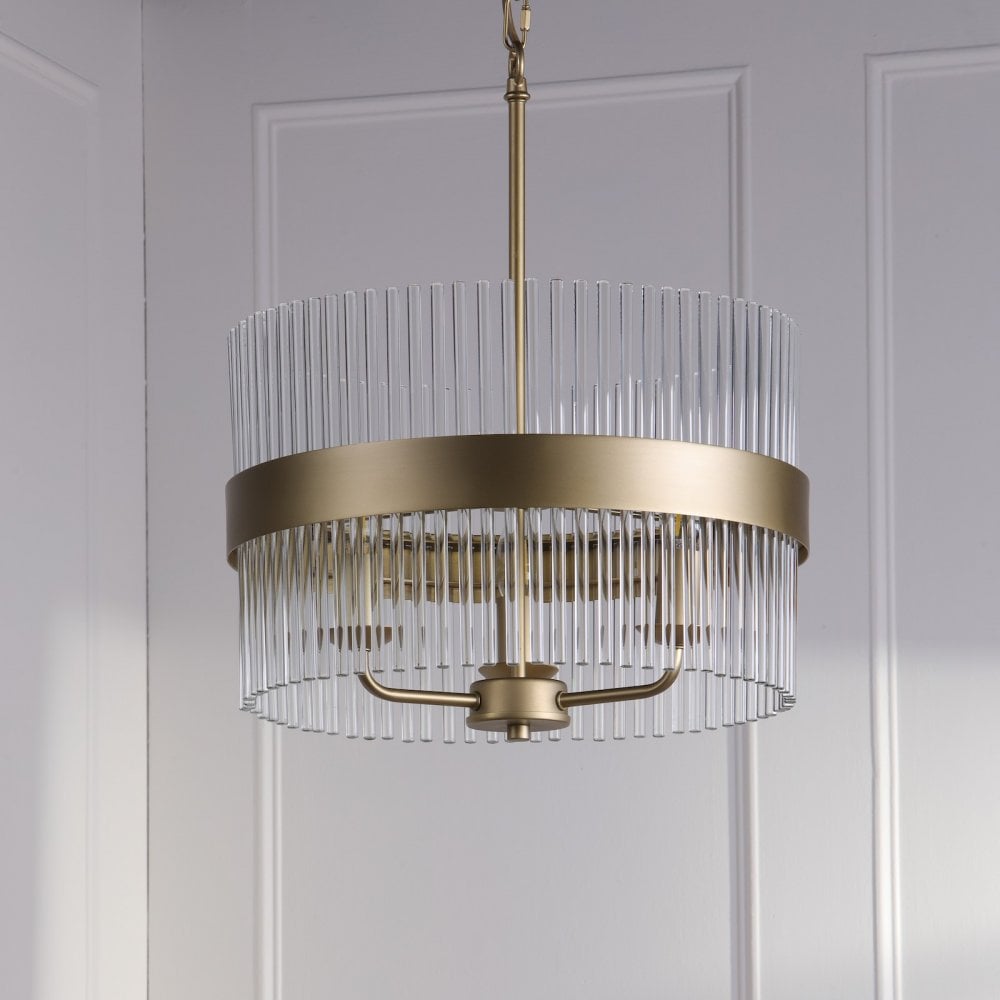 Laura Ashley's Alexa 3 light pendant ceiling light brings vintage flair to the bedroom, living room or hall. Its matt antique brass finish and glass rod detailing radiate an old-world charm, while the trio of exposed bulbs provide soft, layered lighting to set the mood for relaxation. This pendant light makes a stylish statement piece in its own right, yet its understated design allows it to complement a range of decorating styles.