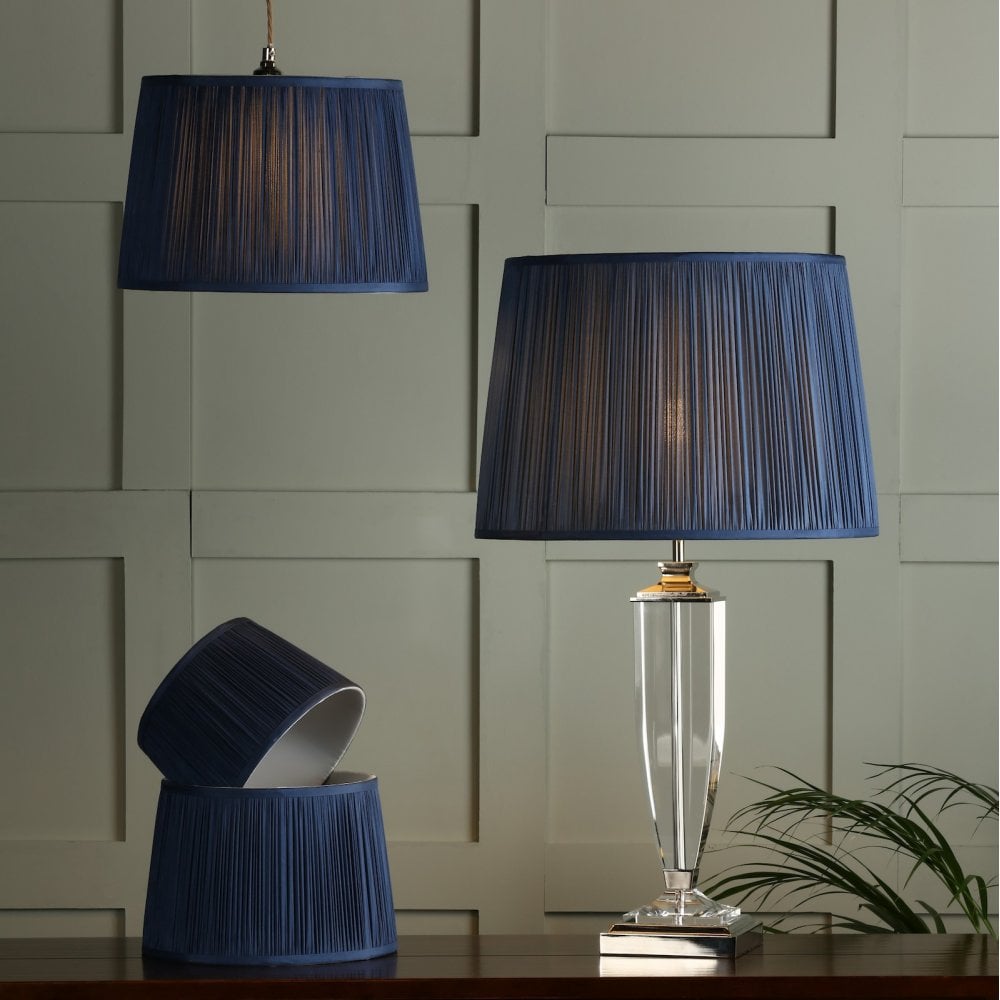 The Laura Ashley Hemsley lightshade has a classic, slightly angled, Empire drum form. Here we finish it in an elegant, pleated smooth silk in midnight blue.