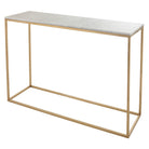 The Faceby Console Table is a chic and sophisticated addition to any entryway or living space. Featuring an open gold boxed frame, this table exudes modern elegance and style. Topped with a beautiful white marble surface, it creates a striking focal point that enhances the overall décor. Ideal for displaying decorative items, plants, or photographs, the Faceby Console Table combines functionality with aesthetic appeal, making it a perfect choice for hallways, living rooms, or as a stylish accent in any room of your home.